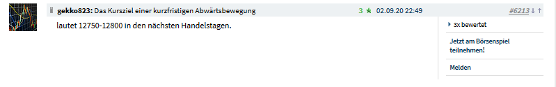Da Dir keiner zu den Charts antwortet, ich bin kein super Experte. Das im Tageschart ist keine zwingende Umkehrformation, zumindest nach meinem bescheidenen Wissen. Das wäre ein Hammer. Es kann eine Signalkerze werden, wenn Dienstag Am Dienstag entweder ein höher grüne entsteht, Morningstar, dafür sind die Dochte recht lang, oder sie von einer Grünen umhüllt wird. Bullish reversal. Also Dienstag abwarten, imo. Sorgen macht mir der Wochenchart. Das war ein beinahe bearish reversal. Und es sieht wie copy and Paste von der Formation vor dem Corona Crash aus. Mit dem Fundamentalwissen um die Optionsgeschäfte Ist kurz vor dem Hexensabbath alles möglich. Die Frage ist, seit wann sie kaufen, aber der drastische Anstieg ging Ende Juni los, nach der Fronleichnamkorrektur. Wenn das alles bei den vier Werten negiert wird, dann werden wir nächste Woche noch Spaß haben. Das wird andere Werte mitnehmen und worse case durch technische Barrieren hauen, so dass die Algos Abverkäufe starten.