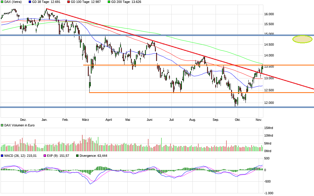 Nimmt er auch den Widerstand bei 13600 und 200TageLinie raus, und kann sogar nochmal 10% bis zum Widerstand bei 14900 draufpacken? Oder geht es jetzt wieder abwärts?