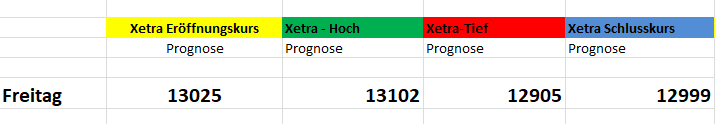Ich hatte dir gestern abend geantwortet und daran hat sich nichts geändert. Der Dax ist übergeordnet weiterhin im Short-Modus solange es per Wochenschlusskurs unter 13100 notiert. Es gibt aktuell einen Ausbruchsversuch auf der Oberseite. Einige institutionelle Investoren nutzen Kursrücksetzer um ihre Aktien-Bestände aufzustocken, denn im 4.Quartal dürften noch weit höhere Kurse erreicht werden, im Dax z.B. stehen die 13800 im Raum. Aber die Frage ist wann der Startschuss (Wochenschlusskurs über 13100) hierfür erfolgt. Ich rechne spätestens Anfang November, also direkt nach den US-Wahlen, mit einer Erleichterungsrallye, die bis zur Silvester-Nacht andauern dürfte, egal wer die Wahl gewinnt. Ich rechne mit einem letzten oder vorletzten Rücklauf bis zur 12700, wo ich auch eine große Longorder positioniert habe, und spätestens dann sollte die Jahresendrallye sich entfalten. Für morgen gehe ich von fallende Kurse bis 12880 aus, wenn die 13100 nicht geknackt werden.