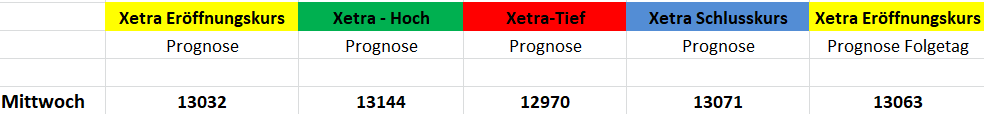 Daher wäre meine statistische Prognose für morgen im Xetra-Handel bullischer Natur, gepaart mit den historischen Daten nachstehend würde ich um 17.30h einen Bereich von 13.070-13.100 als Zielkorridor für den Dax werten.