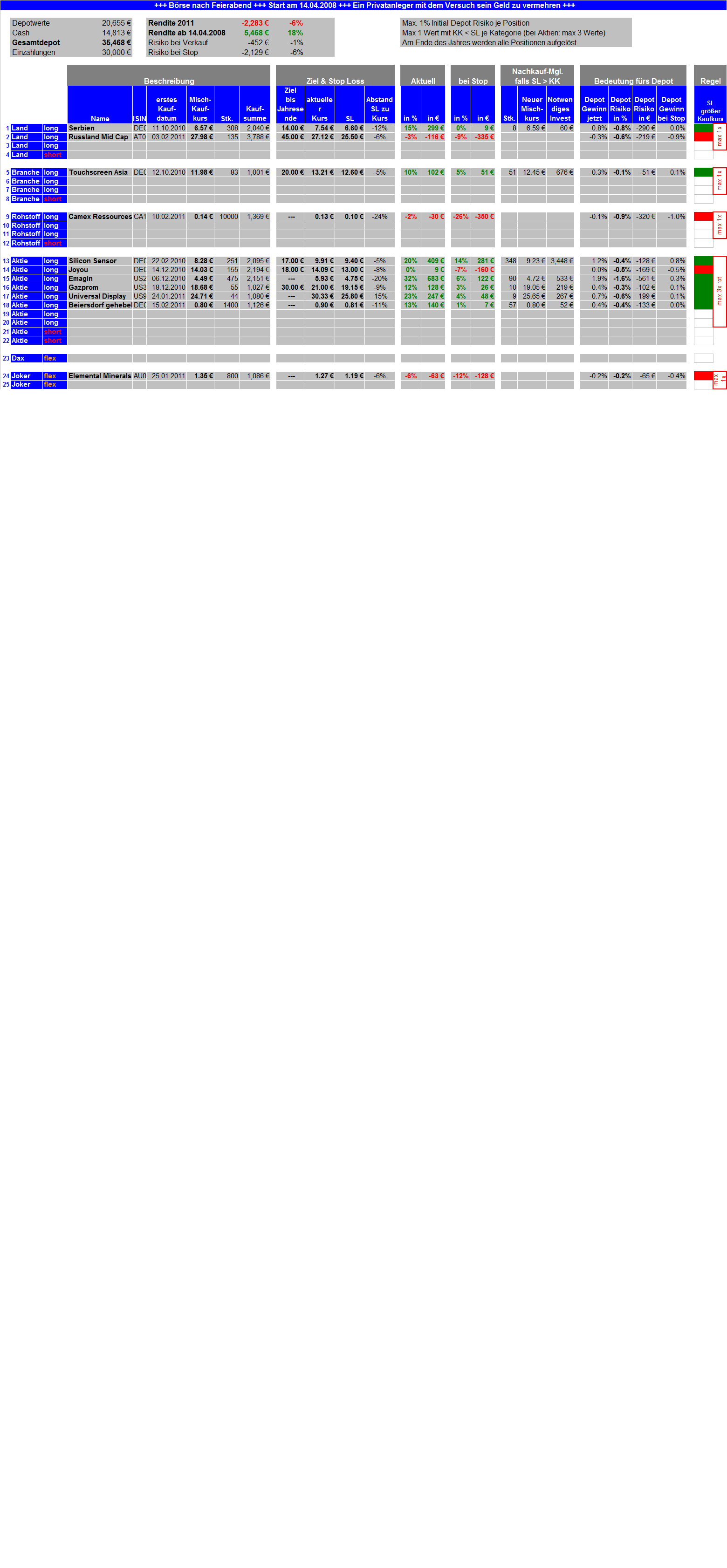 Es gibt ein Trading-Depot mit maximal 10 Positionen in dem ich alle meine Überlegungen zu Nebenwerten, Explorern, Rohstoffen, etc.ausleben kann. Da es keine einheitlichen Einstiegsregeln gibt, ist es wichtig Neueröffnungen erst zu eröffnen wenn sich bestehende Positionen entwickeln. Das initiale Depot-Risiko beim Eingehen einer Position liegt bei -0,5%. Nachkäufe sind so lange möglich, wie der Mischkurs über dem StopLoss liegt. Nachkäufe im Verlust sind verboten. Ein Take-Profit Verkauf erfolgt erst wenn der Depotgewinn dieser Position auf 5% angewachsen ist, der Wert also das 10-fache seines Initial-Risikos eingespielt hat.