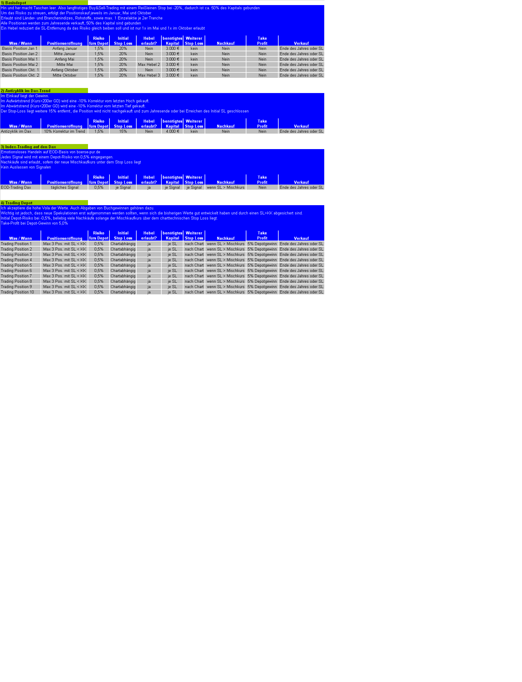 Es gibt ein Basisdepot für welches ich jeweils 2x im Jan, Mai, Oktober konservative Index-Werte kaufe, mit einem Reißleinenstop von -20% versehe und bis Ende des Jahres laufen lasse. Jede Position stellt 1,5% Risiko fürs Depot da.