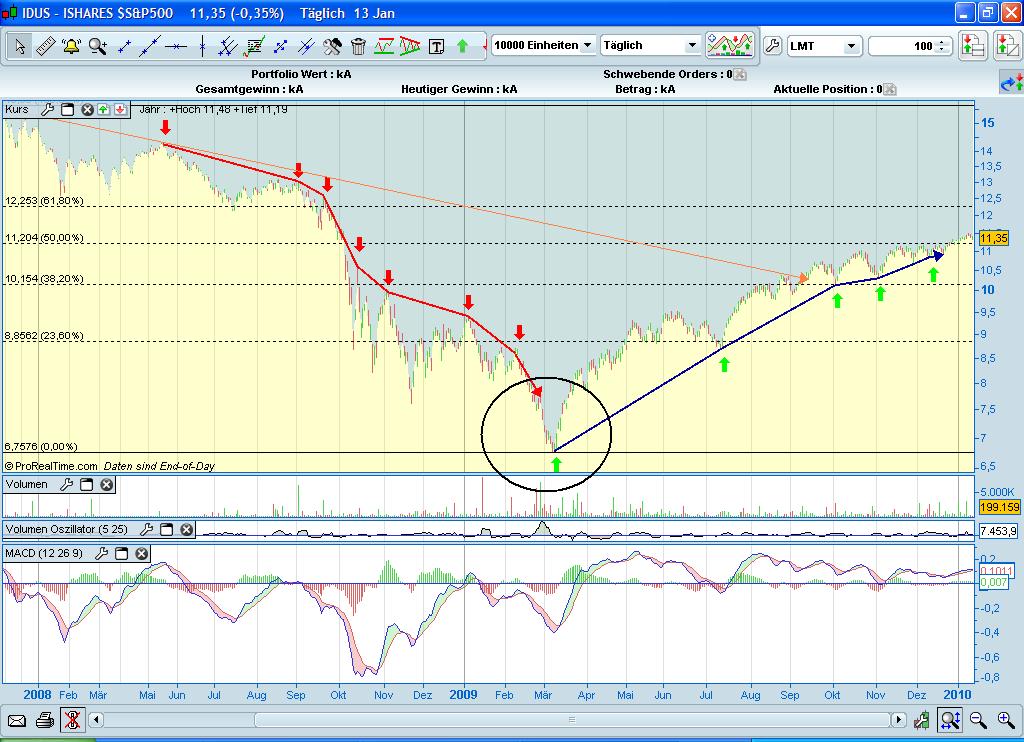 liegt in der Analyse der absoluten Tief - bzw. absoluten Hochpunkte einer Bewegung - hier am Beispiel des S&P500 (sehr breit aufgestellter Index) - seit Beginn dieser Finanzkrise bzw. den ersten Kursrutsch bis hin zur "Wende" im März folgten konstant abfallende Hochpunkte - das Hoch einer jeden mittelfr. Bewegung lag unterhalb des davorigen - man verbindet diese Hochs und erhält einen Trend - in diesem Fall einen Abwärtstrend. Seit März genau andersherum - die Tiefpunkte im Index auf mittelfr. Sicht liegen immer oberhalb der davorigen. So kommt man zum Aufstellen eines Musters, welchem der Markt folgt bzw. welches den Trend sehr genau angibt. Interessant ist hierbei die Komnination mit MACD/Aroon zur Untermauerung dieser These - des weiteren das Beobachten wie sich übergeordnete Trendlinien, wie der im Dezember letzten Jahres gebrochene übergeordnete Aufwärtstrend, verhalten... dieses Muster funktioniert im übrigen auch intraday, insofern der Timeframe (Zeiteinheit) nicht zu gering gewählt ist - aufwärts 30 Min Chart. Wichtig bzw. entscheident hierbei ist nur der Candleclose, nicht aber die Bewegung im Docht über diesen Zeitraum.