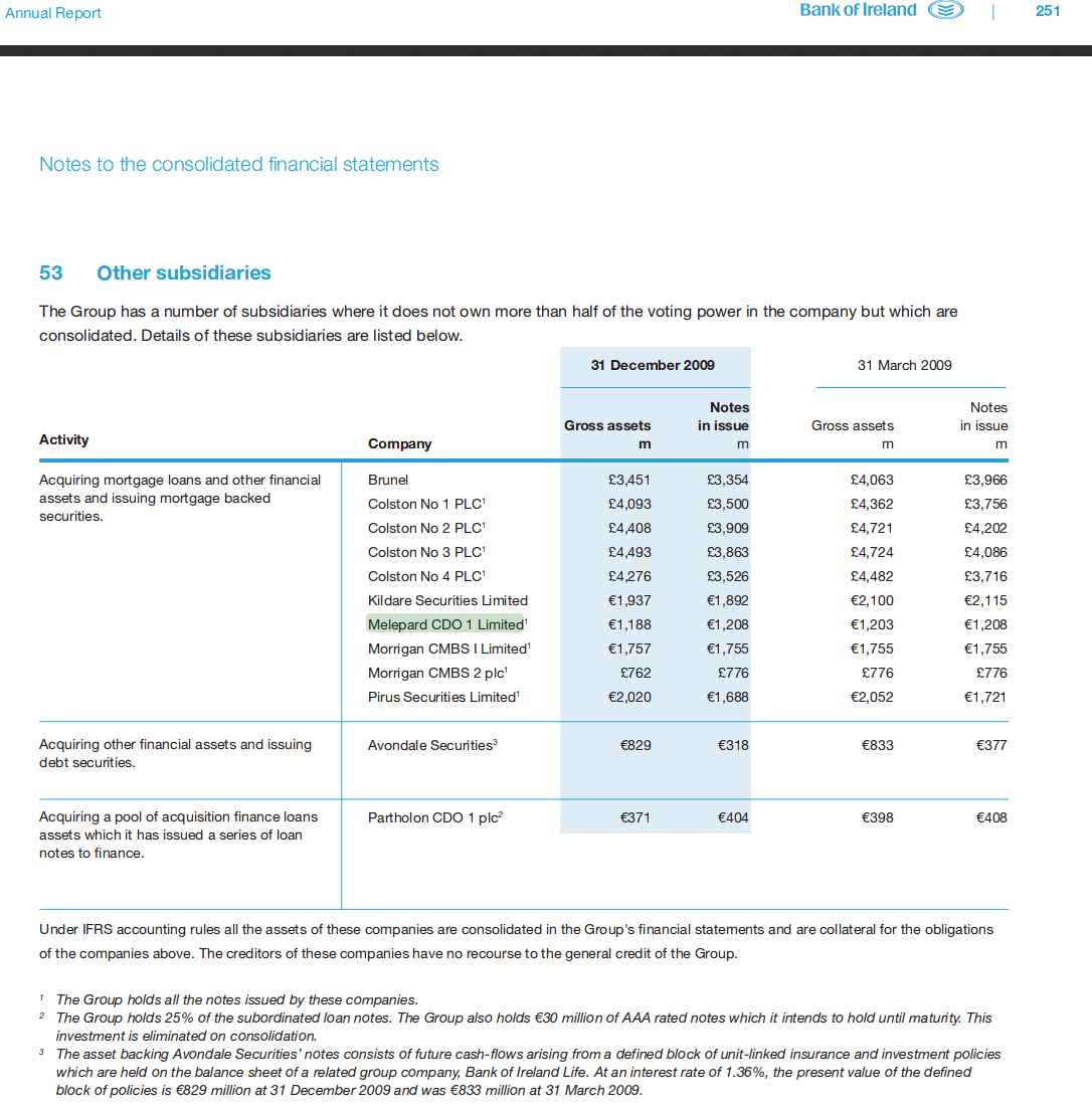 In 2009 wurde über die Tochter MELEPARD CDO Limited Hypotheken und andere Finanzanlagen gekauft und in Collateralized Debt Obligations CDO ( forderungsbesicherte Schuldverschreibungen ) gebündelt. Die Fussnote 1 sagt, dass BOI alle ausgegebenen Papiere dieser Tochter hält.