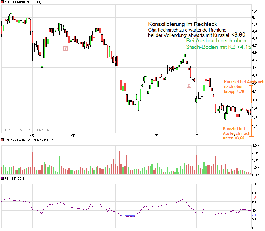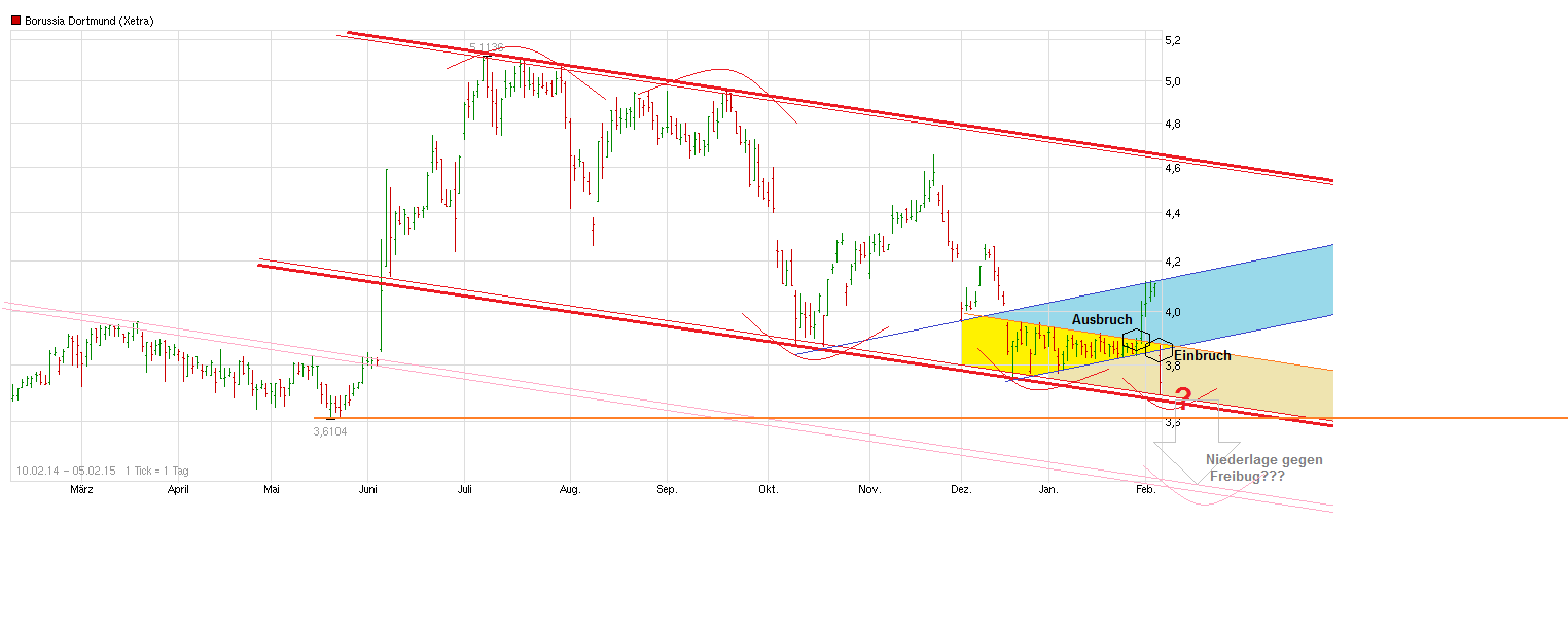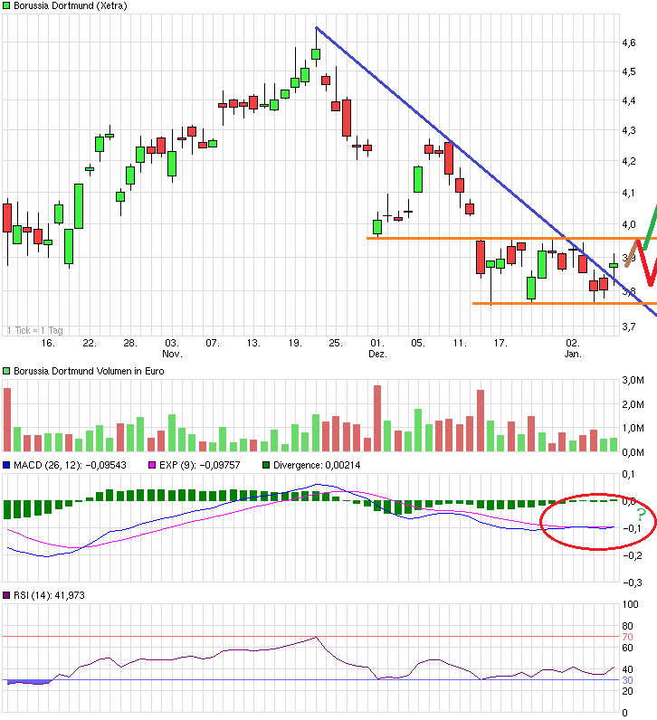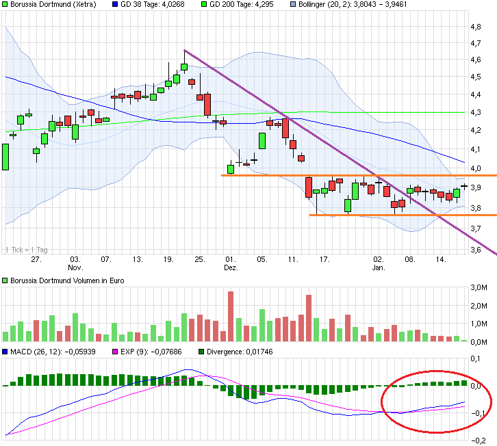 vor der Winterpause extrem stark davon abhing wie gerade das letzte Spiel ausging, haben offenbar in der Winterpause, d.h. der spielfreien Zeit, die Anleger erstmal temporär auf Leerlauf geschaltet. Man pendelt müde seitwärts mangels irgendwelcher echt neuer Impulse. Von daher dürfte erst Ende Januar mit dem Spiel gegen Leverkusen wieder mehr Leben reinkommen. Wenn man bis dahin weiter in dieser jüngsten Schlafwagen-Spanne läuft, dann geht dadurch auch nichts kaputt auf etwas längere Sicht. Wobei die Frage eben ist, ob alleine eine Niederlage zum Start das Sentiment so weit drücken könnte, daß man unter die Lows vom Dezember geht oder ob man sich mit Blick auf den Hinrundenverlauf darauf einstellt diese Saison gegen die großen 3-4 Mannschaften an der Spitze nicht mehr viel bewirken zu können und die nötigen Punkte bei den "Kleineren" holen wird. Von daher ist beim Spiel am 4.2. zuhause gegen Augsburg die Erwartungshaltung deutlich höher als am 31.1. auswärts gegen Leverkusen. Umso netter könnte der Kurshüpfer aber sein, wenn man in Lev. doch gewinnt. Würde daher erwarten, daß man sich kurz vor dem Spiel eher am oberen Rand der gegenwärtigen Range befinden wird, weil vermutlich wieder einige spekulativ Zocker auf einen "Überraschungssieg" setzen. Das könnte das Gap vom 15.12. schließen. Und würde dann wenige Tage später noch Augsburg geschlagen, dann könnte das Sentiment schnell auch wieder drehen und die SMA200 wieder in erreichbare Weite kommen kommen. Von daher muß man einfach warten wie der Start ins neue Jahr gelingt. Kommen ungünstigerweise zwei Niederlagen, dann ist man vermutlich im tiefen 3,60er Bereich. Solange man sich nicht stabil im Mittelfeld mit einem gewissen beruhigenden Punkteabstand zu den Abstiegsplätzen wieder befindet, dürfte einfach diese erhöhte spieltagabhägige Vola vorhanden bleiben.