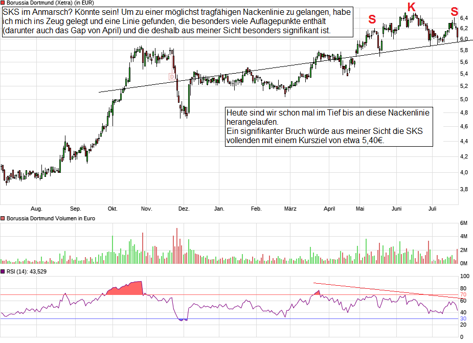 Wenn das eine SKS ist, würd ich jedenfalls in fast allen Charts diversen Aktien irgendwo eine SKS entdecken, denn ein Hoch nach einem Zwischenhoch gibt es ja fast überall. Ob dann das darauf folgende tiefere Hoch, dass das generelle Hoch noch nicht überwunden hat, zu einer zweiten Schulter wird, ist in keinem Chart der Welt klar. Das also so früh schon als SKS zu deuten, ist schon ziemlich merkwürdig. Bislang ist es einfach ein typischer Aufwärtstrend mit mehreren höheren Hochs. Ob die aktuelle Kursrange ein tieferes Hoch mit einem anschließend tieferen Tief wird, ist erstmal unerheblich weil spekulativ. Wie gesagt, dann gäbe es in jedem Chartbild mit mindestens zwei höheren Hochs kurzzeitig eine mögliche SKS in der Konsolidierungsphase nach dem letzten Hoch.