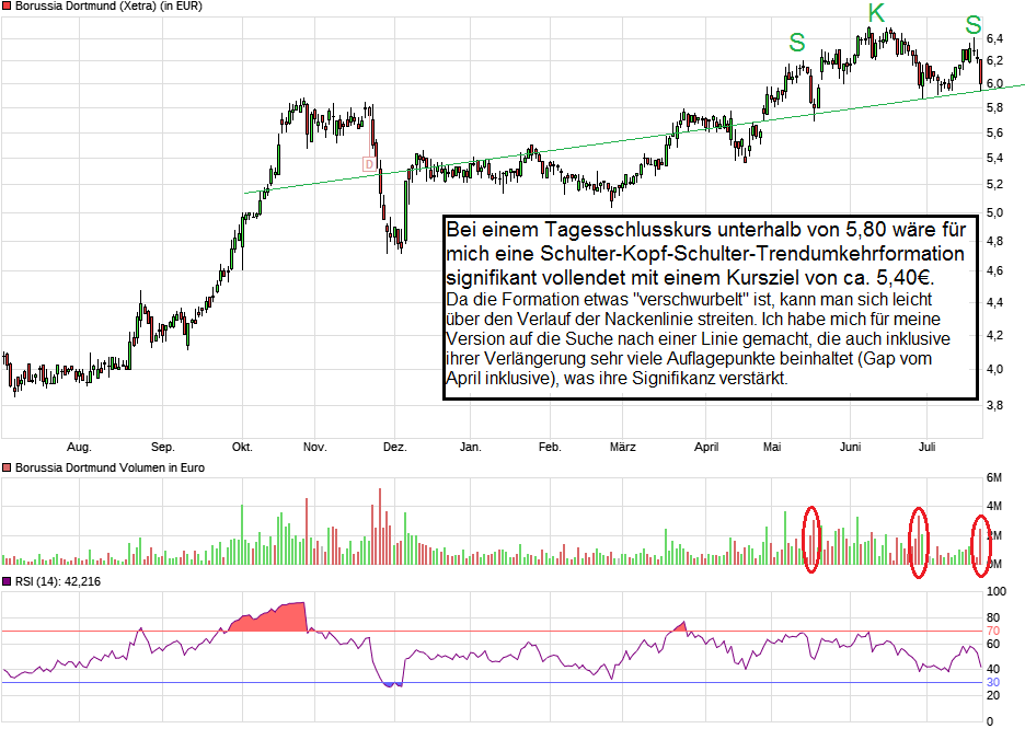 Ich weiß nicht, wie die Zahlen ausfallen werden für das vergangene GJ, gehe aber von einem schwachen Ergebnis aus. Ich weiß auch nicht, inwiefern das den Markt kümmern wird. Und ich will auf jeden Fall nicht für lange in die BVB -Aktie investieren, sondern allenfalls für ein paar Wochen. Auf welchem Niveau ich genau einsteigen würde, ob bei 5,40 oder bei 5,55, weiß ich nicht, macht das denn so einen Unterschied - das sind gerade mal 3% Unterschied...