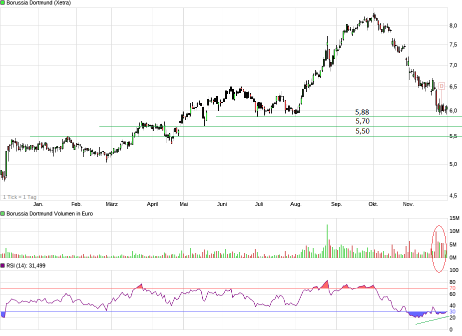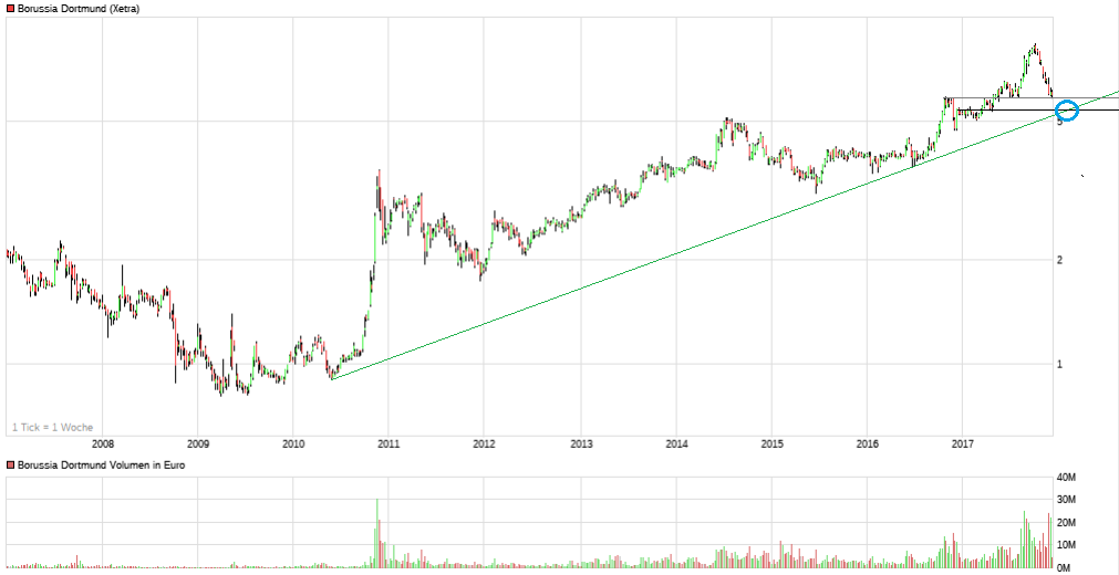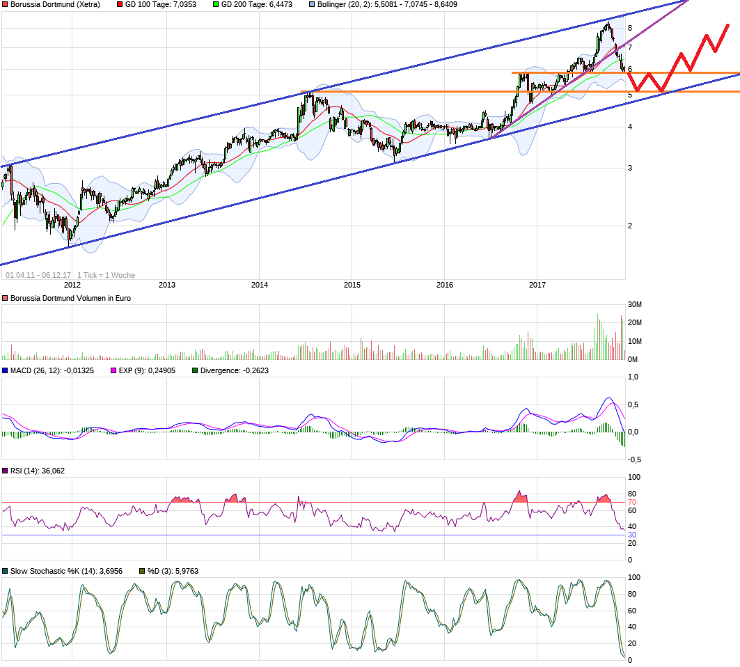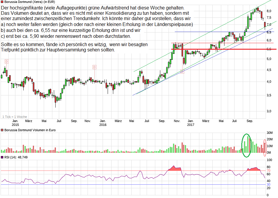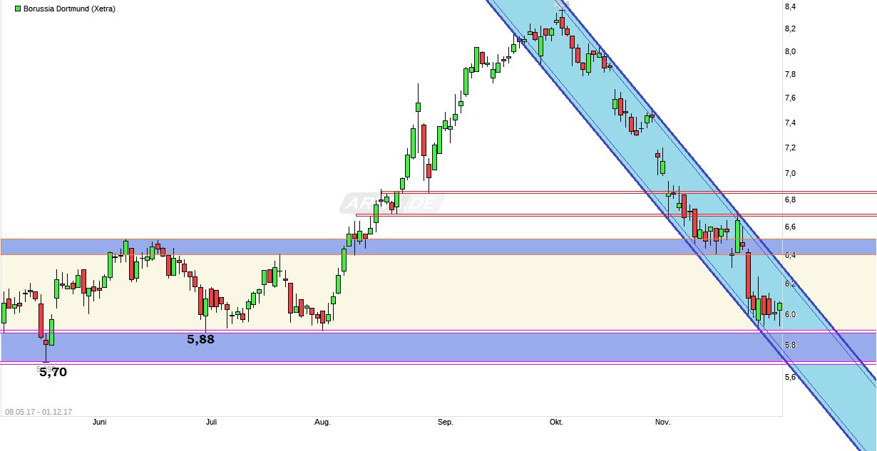 Siegen läßt sich offenbar vorerst keine nennenswerte Gegenreaktion erreichen. Das Unentschieden hilft aber zumindest erstmal den Kurs etwas zu stabilsieren. Und mancher Anleger will auch noch schnell die Divi mitnehmen die nach der HV eingebucht wird. Nachdem die horizontale Unterstützungszone um die 6,40/50 gefallen war, ist dann wenig überraschend die nächsttiefere Unterstützungszone zügig angelaufen worden Ende letzter Woche. Somit "Zurück auf Los". Man ist jetzt genau da wieder gelandet wo man war als der Dembele-Hype im August begann. Übertrieb man es danach zu sehr nach oben? Übertreibt man es jetzt nach unten? Liegt die Wahrheit in der Mitte? Man ist weiter noch im kurzfristigen schwarzen Abw.trendkanal und bräuchte endlich positive Impulse um den nordwärts zu verlassen. Das Unentschieden gegen Schalke ist nicht Fisch und nicht Fleisch. Der eine Punkt drückt nun nicht groß und hebt nicht wirklich sonderlich. Die Erwartungen vor dem Spiel waren ja auch bei vielen Leuten schon so, daß man hier kaum einen Sieg holen würde. Entsprechend kam ja schon der Rutsch Richtung 6€ Marke vor dem Spiel.