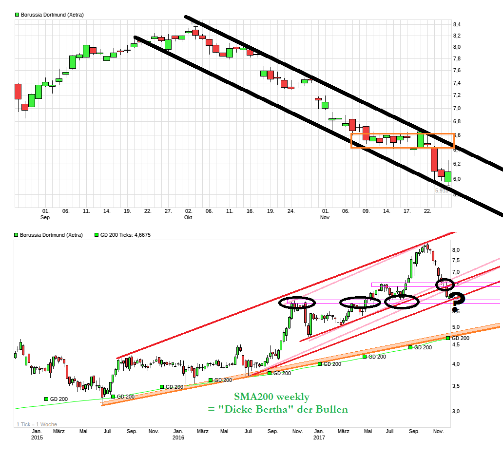 Ein Sieg könnte somit sehr größere Erleichterung am Montag danach bedeuten. Psychologie kann bei Aktien nach oben/unten Übertreibungen bewirken die zu deutlichen Abweichungen vom eigentlichen fundamentalen Kern führen. Da keiner die nächsten Spielergebnisse kennt, ist gegenwärtig weiter noch vieles möglich. Kann durchaus sein man hat das Tief jetzt erreicht und die Unterstützung um die 5,90/6,00 ist wehrhaft genug. Aber sollte die Negativserie zu lange jetzt doch noch anhalten (was nicht zu hoffen ist, aber auch nicht ausgeschlossen werden kann), dann zeigt ja die Saison 2014/15 wie eine schlechte BL-Hinrunde dem BVB-Kurs massiv zusetzen kann. In dem Falle wäre sogar denkbar es kommt wieder die Weekly SMA200 ins Spiel als große potenzielle Fangleine. Wäre aber schon heftig, wenn es wirklich so käme. Sehe ich also erstmal weiter als gering wahrscheinlich an. Umgekehrt im Falle von Siegen den Abw.trend jetzt im Auge behalten. Kaufsignale mit sportlichem Rückenwind könnten dann durchaus temporär Shorties fix unter Druck bringen, die sicherlich auch in den letzten Wochen zunehmend auf den negativen Trend bei der Aktie setzen. Würde man dadurch wieder stabil über 6,40/50 landen, dann sähe es gleich wieder etwas besser aus. Also mal abwarten was nächsten Montag wirklich los ist.