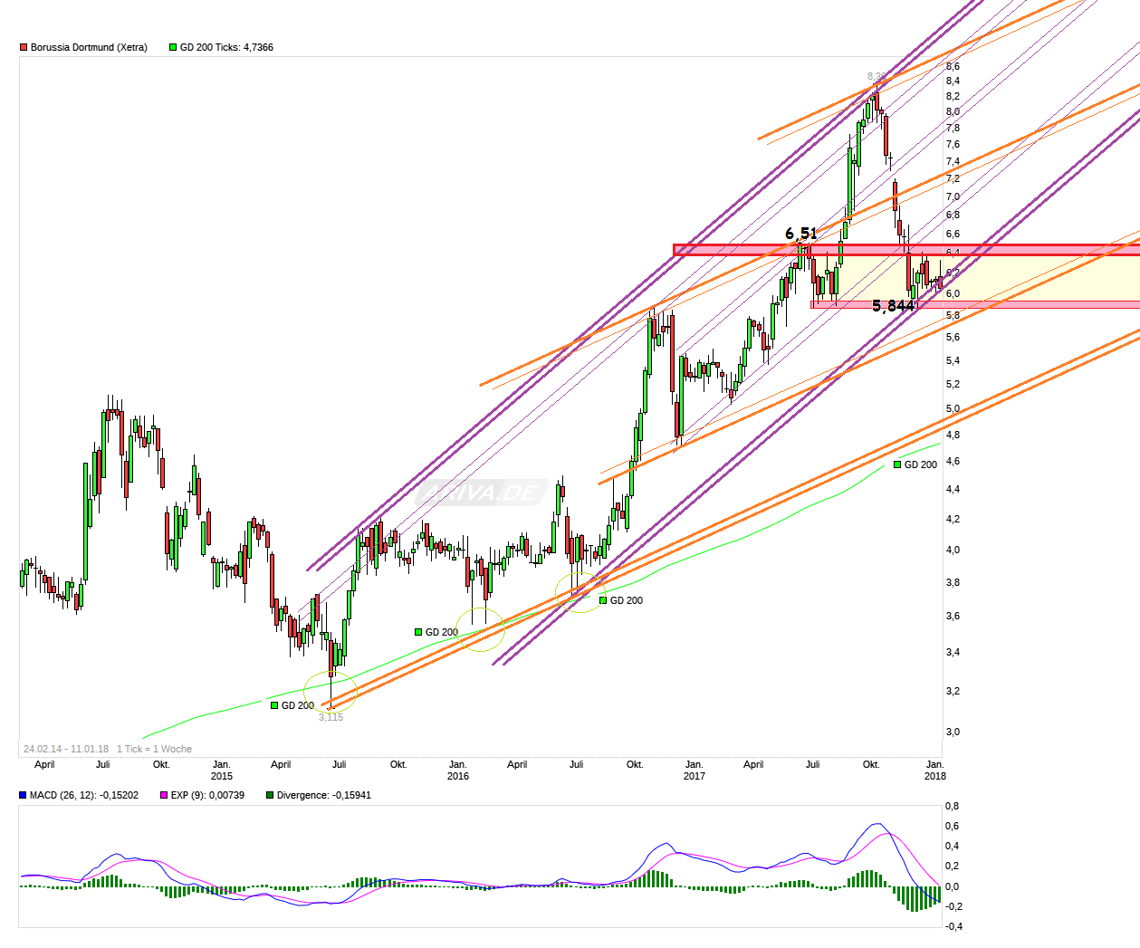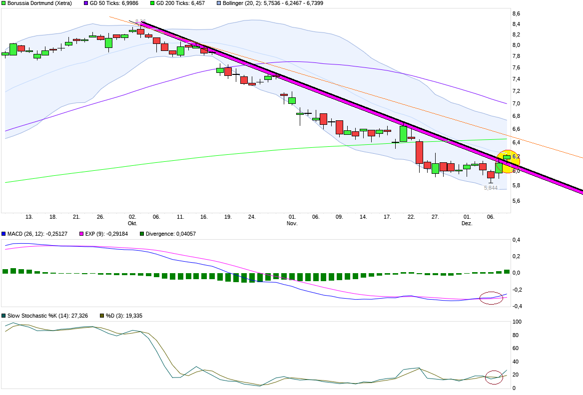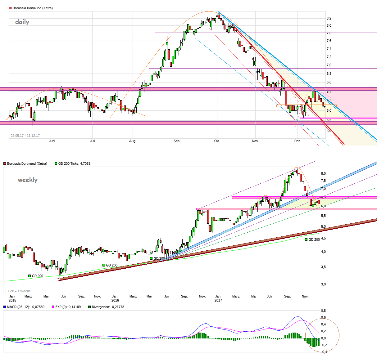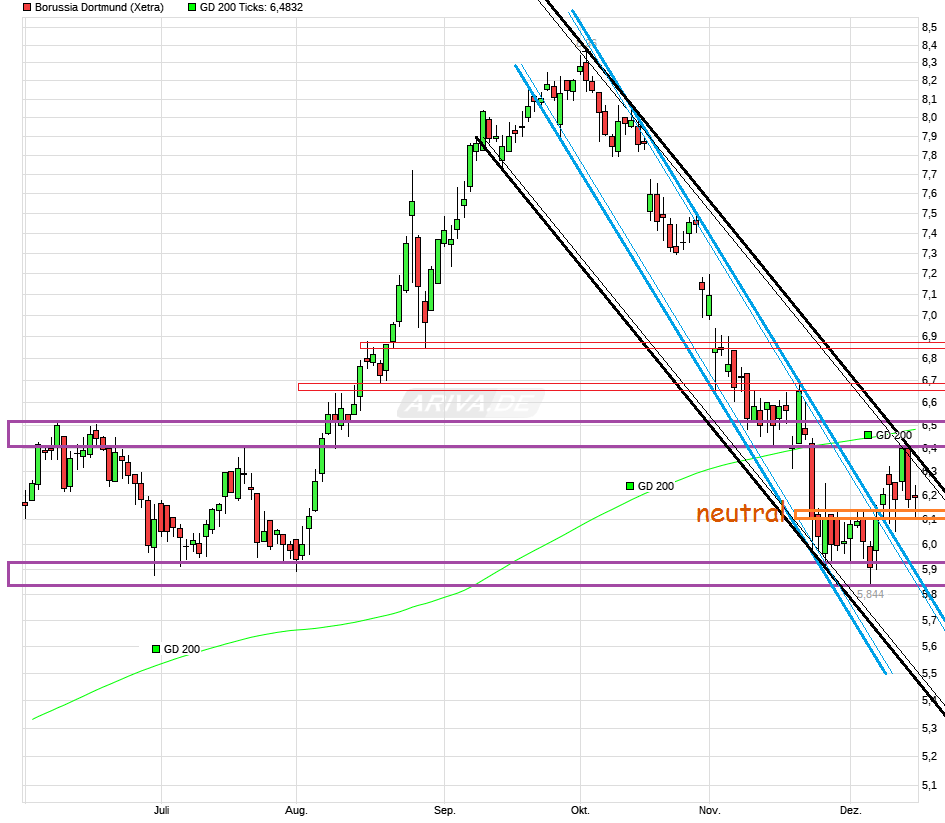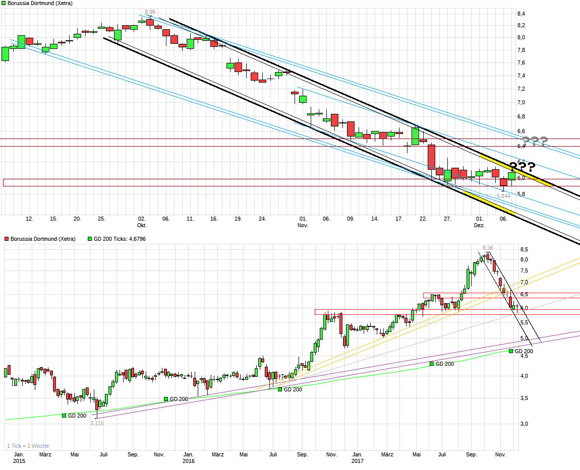 Ist natürlich alles spekulativ und im Bereich um die 6,40/50 wäre ja auch vermutlich schon wieder ein härterer Widerstandsbereich, der dann auch erstmal wieder nachhaltig bezwungen werden müßte. Sollte man auch gegen schwache BL-Gegner wie Bremen und Mainz verlieren, dann wäre es ein sportlicher Offenbarungseid, Watzke/Zork/Bosz in Erklärungsnot und man dürfte der SMA200 im Weekly damit noch näher kommen bzw. die Talfahrt im Trendkanal fortsetzen.