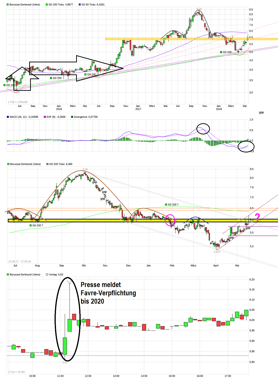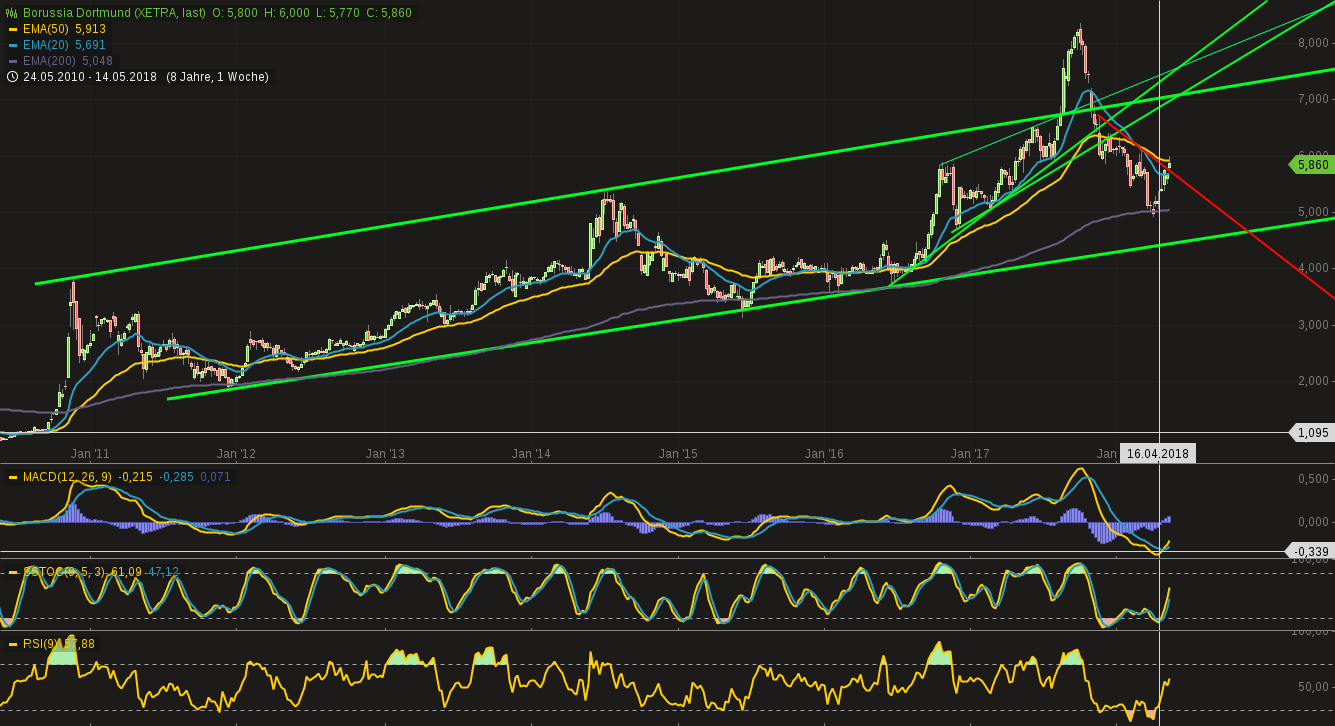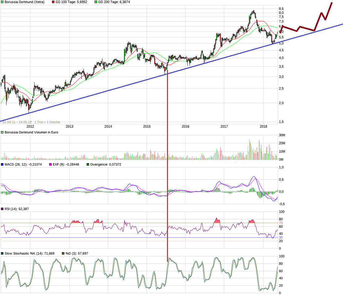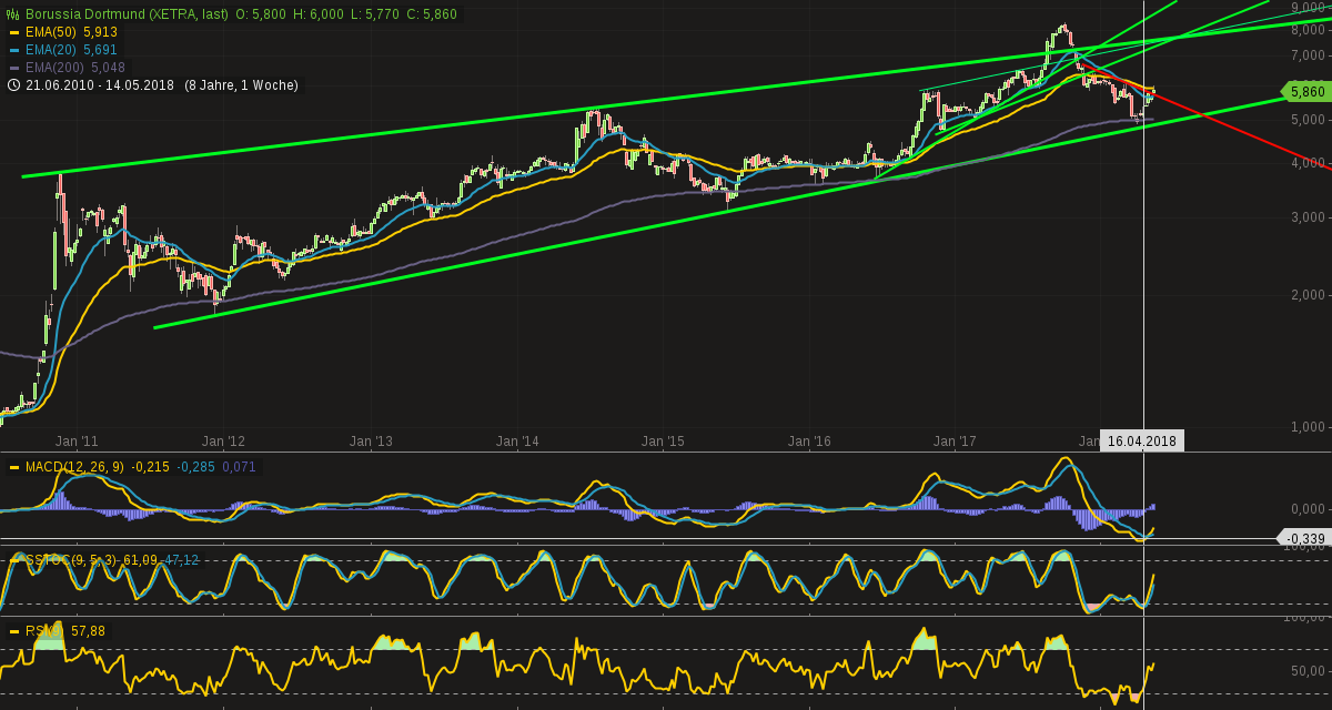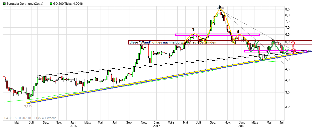 Nur kann kein Chart der Welt Kurse voraussagen. Er sagt beim BVB lediglich, dass sich die Aktie in einem langfristigen Aufwärtstrend befindet, der derzeit bei 5,0-5,1 € verläuft. Es kann also theoretisch sowohl sein, dass wir nochmal bis zu der Trendlinie zurückgehen, als auch eine Seitwärtsphase bekommen oder aber stark aufwärts gehen. Alles ist innerhalb des Trends machbar, aber niemand kann sagen, dass es jetzt haargenau so weitergeht wie ab Frühsommer 2015, nur weil das Chartbild so aussieht wie damals.