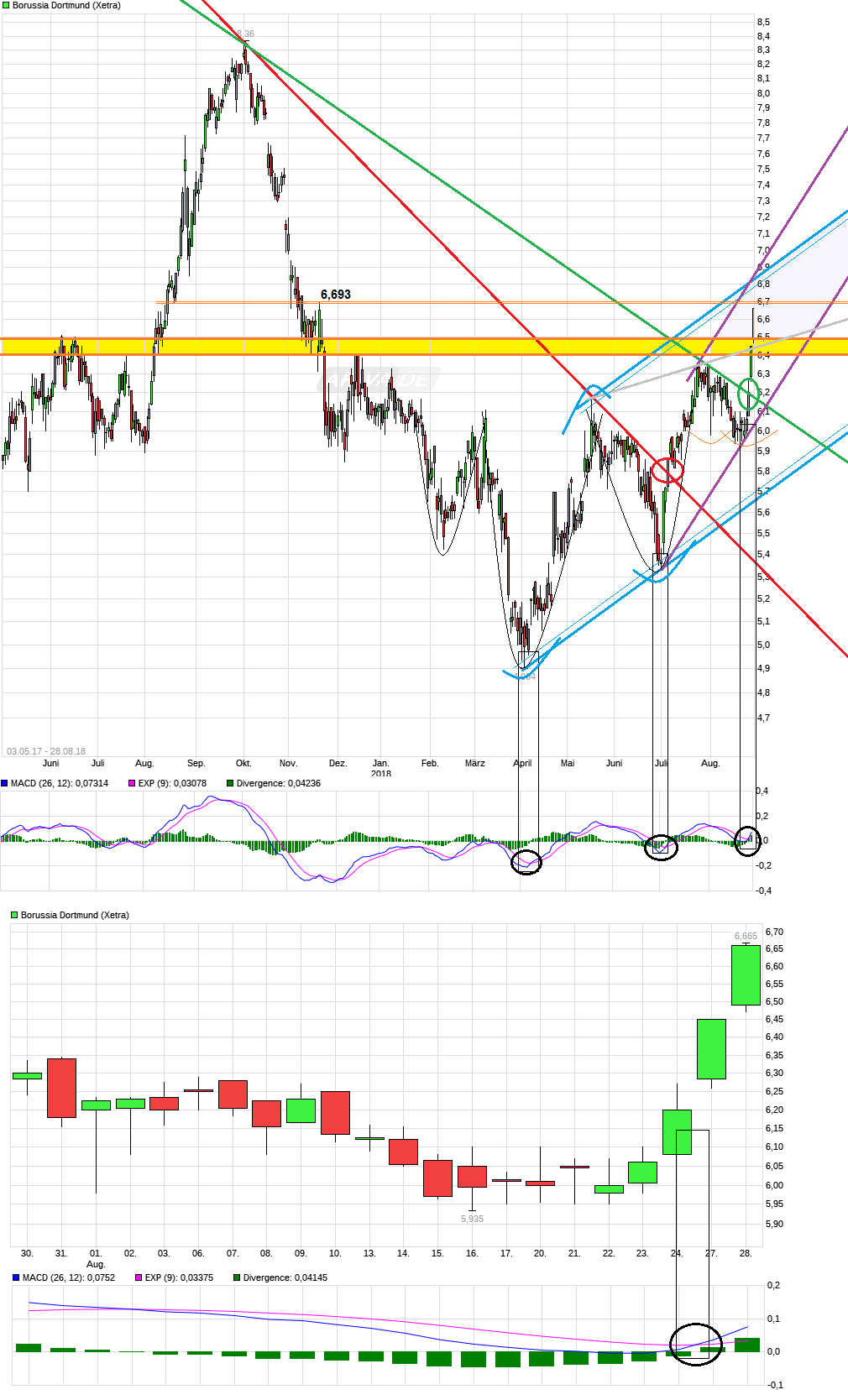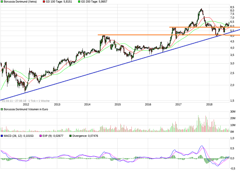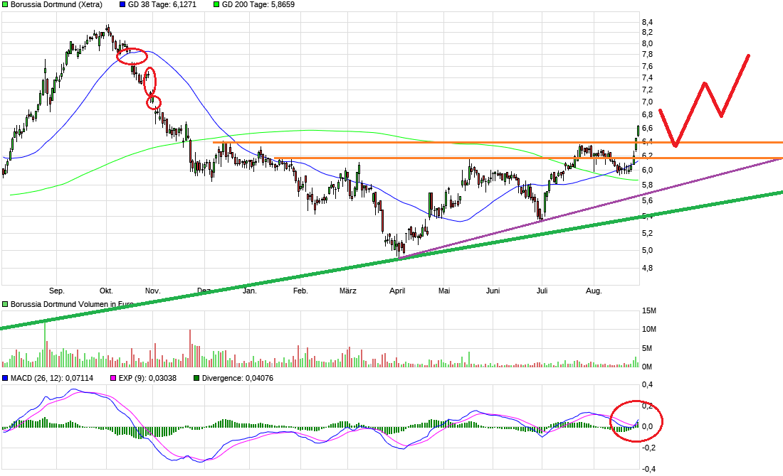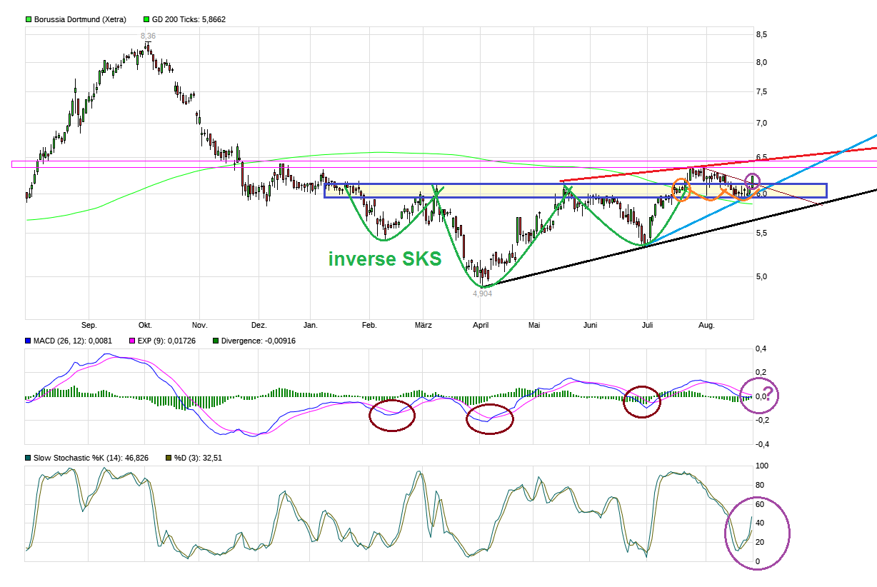Bei schönem Wetter hat man eben gute Fernsicht ;) Muß man mal abwarten wie lange die sonnigen (Spiel-) Tage so weitergehen. Nachdem die Nackenlinie der inversen SKS mit 2 Pullbacks auf ihre Belastbarkeit angetestet wurde, hat der gute Saisonstart natürlich das Sentiment direkt belebt und neben den technischen Käufern auch sicher viele "Emo-Käufer" zum Kauf bewegt. Dazu das gefühlte fast stündliche trommeln der Kulmbacher Scalpertruppe für diesen Wert auf allen medialen Kanälen die sie haben. Damit scheucht man massiv auch deren Jünger rein, die wie immer null Schimmer haben was sie da eigentlich kaufen, aber blind reinspringen, wenn es befohlen wird. Macht den Wert natürlich künftig auch wieder anfälliger für Rücksetzer, wenn schwache Hände gescheucht werden. Angesichts des rasanten Anstiegtempos der letzten Tage dürfte hier bald auch wieder eine kurzfristige Überkauftheit entstehen. Denke da wird natürlich direkt eine Rolle spielen wie der nächste Spieltag ausgeht. Sollte man Punkte abgeben, dann könnte die große Euphorie wieder (temporär) etwas nachlassen und auch mal wieder etwas ausgeatmet werden. Heute hat man auch die Widerstandsregion 6,40/50 nach oben rausgenommen (damit wieder über die Tops vom Juni17 gestiegen). Auch ein Zeichen dafür wieviel Dampf hier gerade im Kessel ist. Wäre wichtig im Falle einer Gegenreaktion dann möglichst nicht mehr nachhaltig unter diese Region zurückzufallen, sondern das "neue Stockwerk" möglichst weiter zu verteidigen. Nächster horizontaler Widerstand liegt bei ca. 6,70. Mal schauen wie hart der jetzt auch gleich mitangegriffen wird. Der MACD hatte vorgestern mit dem Triggerschnitt nach oben ein frisches weiteres Kaufsignal geliefert. Muß man jetzt mal schauen, ob man sich vielleicht in Form eines Kanals hier weiter nach oben bewegen wird. Würde sich z.B. der blaue Kanal etablieren, dann wäre die Oberseite z.Z. bei ca. 6,80. Sollte die Euphorie weiter so (über-) groß bleiben, dann könnte es auch im steileren lilafarbenen Kanal weitergehten Richtung 6,90/7,00. Wäre mir dann aber schon etwas zuviel des Guten. Ein oder zwei Spieltage sagen noch nichts wirklich aus wo man am Ende steht (man denke an letzte Saison!!!). Von daher ist mir eigentlich lieber es würde etwas gemäßigter im Chart verlaufen und dafür nicht nach zu heftigen Anstiegen gleich wieder zu heftig "ausgeatmet".