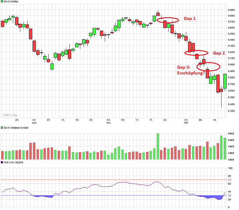 Der DAX ist übrigens noch nicht so weit zu seiner Erschöpfungslücke hoch gelaufen wie der BVB. Dafür bilden bei ihm die drei letzten Tageskerzen ein extrem bullisches Muster, das einen nicht positiven Montag extrem unwahrscheinlich erscheinen lässt: