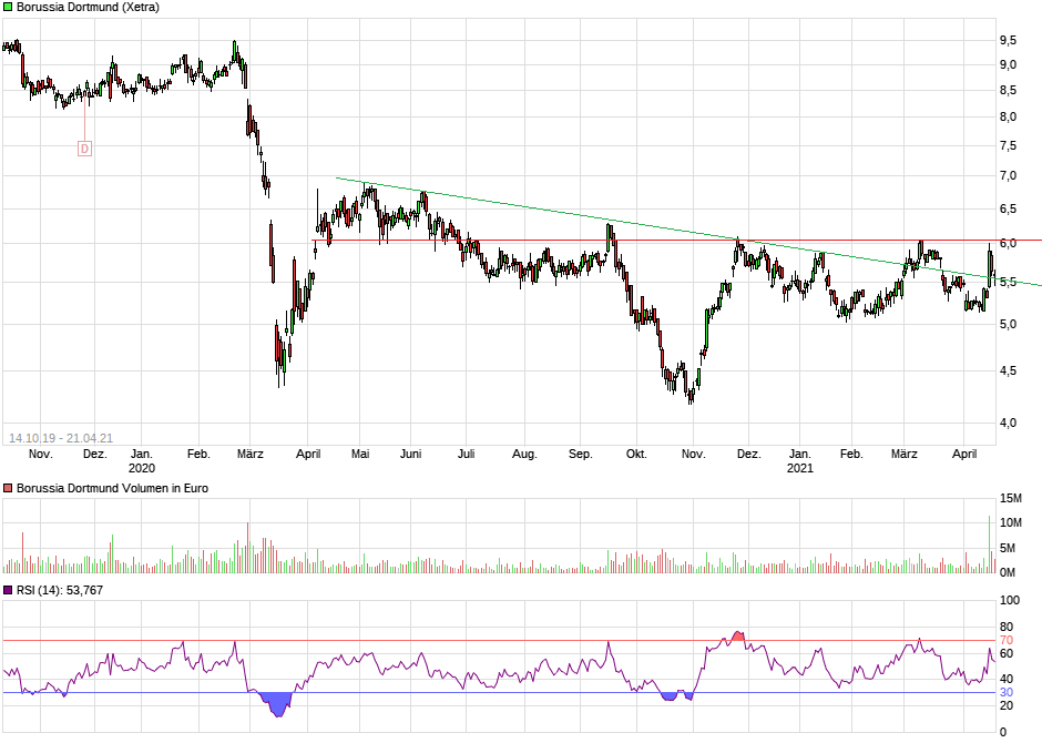 NICHT vorangig um sportl Ergebnisse. Als der Aktienkurs sein Coronatief bei 4,172 erreichte, stand BVB am 2.11. punktgleich mit Bayern an der Tabellenspitze, jetzt aber gibt es die klare Gefahr, daß man die erneute CL Qualifikation verpassen könnte. In so einer Situation konnte die BVB Aktie völlig eindeutig besser performen als der DAX. Es geht also wieder mal