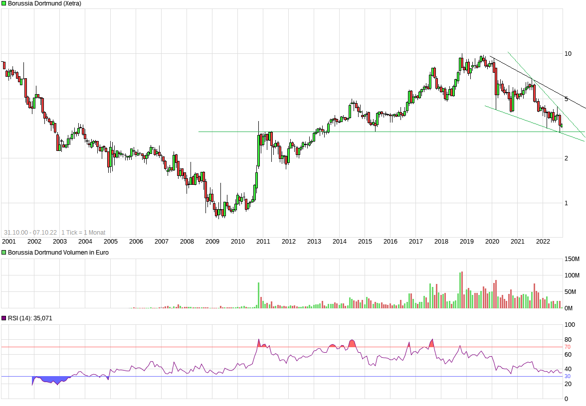 Durch den plötzlichen starken aktuellen Rücklauf im DAX und der meist engen Korrelation zwischen DAX und dem BVB Kurs, könnte es jetzt vielleicht nochmal zum harten Test der seit März steigenden schwarzen Aufw.trendlinie kommen. Hängt wohl im Kern davon ab, ob der Gesamtmarkt sich von dem aktuellen schnellen Rücksetzer wieder bald erholen kann oder sich die Bewegung dort weiter südwärts fortsetzt. Durch den großen Verfallstag am Freitag ist schwer zu sagen was aktuell nur hektische Korrektur von Schieflagen im Markt ist und was sich dann bewegungsmäßig ab nächster Woche vielleicht wieder beruhigt.