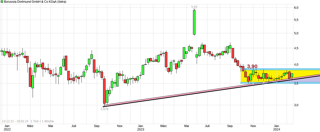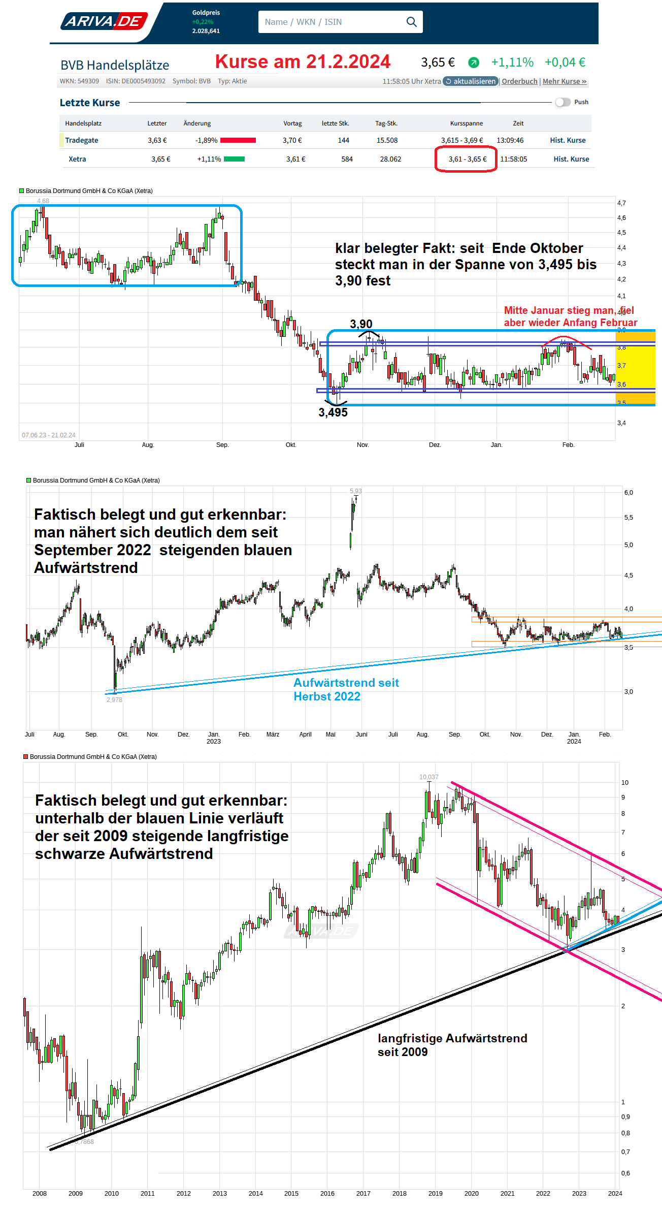 Wie jeder im Chartbild unten gut sehen kann, zog Mitte Januar 2024 der Kurs an, ging auch kurzzeitig mal über 3,80 und ist dann doch Anfang Februar 2024 wieder relativ klar zurückgelaufen bis gestern wieder nahe an die 3,60er Marke. Damit ist es nicht gelungen über die Marke 3,90€ auszubrechen, d.h. dem Hoch von Anfang November 2023. De facto ist man somit weiter seit Ende Oktober 2023 in der Seitwärtsspanne 3,495/3,90. Aktueller Xetra-Kurs ist um die 3,65, Tagestief war am Vormittag auf Xetra bei 3,61€.