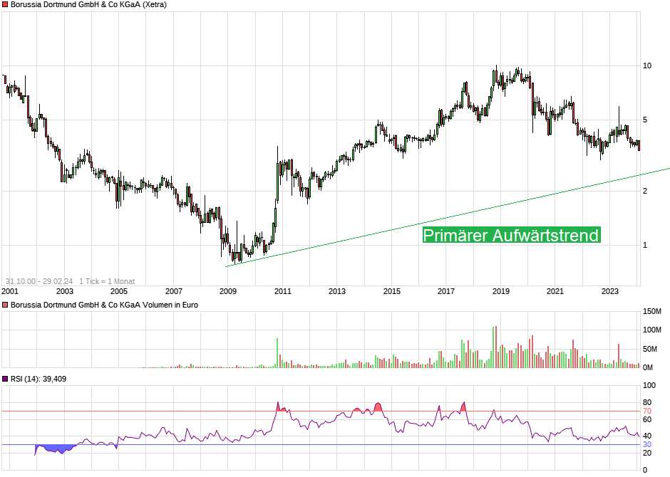 Wie das Chartbild unten ebenfalls belegt, kommt man dem seit Herbst 2022 leicht steigende Aufwärtstrend unaufhaltsam näher. Aktuell ist man nur ganz knapp davon entfernt. Bin gespannt, ob diese Linie von der Käuferseite jetzt hinreichend weiter verteidigt wird. Sollte es doch noch zu einem eventuellen Break dieser Trendlinie kommen, dann wäre zu schauen was eine weitere darunter verlaufende potenzielle Auffanglinie sein könnte aus technischer Sicht. Wie man im Chartbild unten ebenfalls sieht, verläuft der seit 2009 steigende langfristige schwarze Aufwärtstrend noch etwas tiefer als die seit Herbst 2022 steigende blaue Aufwärtstrendlinie. Das wäre für mich persönlich dann eine nächste mögliche Auffanglinie. Gleichzeitig wäre aber auch noch die 3,495€ von Ende Oktober 2023 eine horizontale Unterstützung. Grundsätzlich fände ich es zwar wünschenswert, wenn hier längerfristige Trendlinien weiter Bestand hätten. Aber Börse ist kein Wunschkonzert. Deswegen bleibe ich hier im Moment noch etwas weiter an der Seitenlinie bis ich das Gefühl habe man entfernt sich doch von diesen Linien etwas deutlicher wieder nach oben.