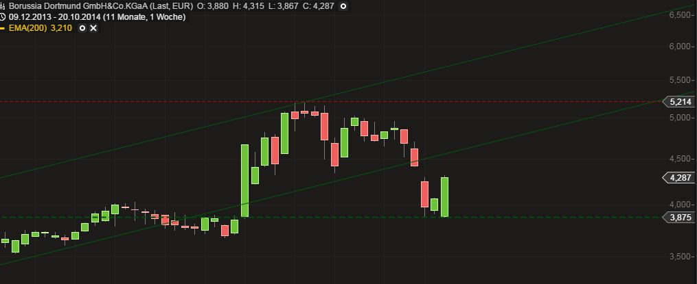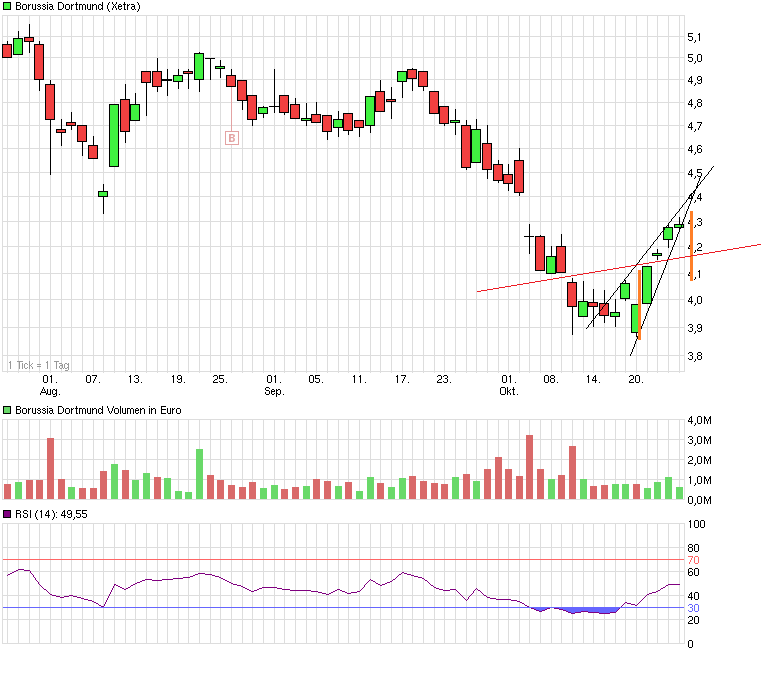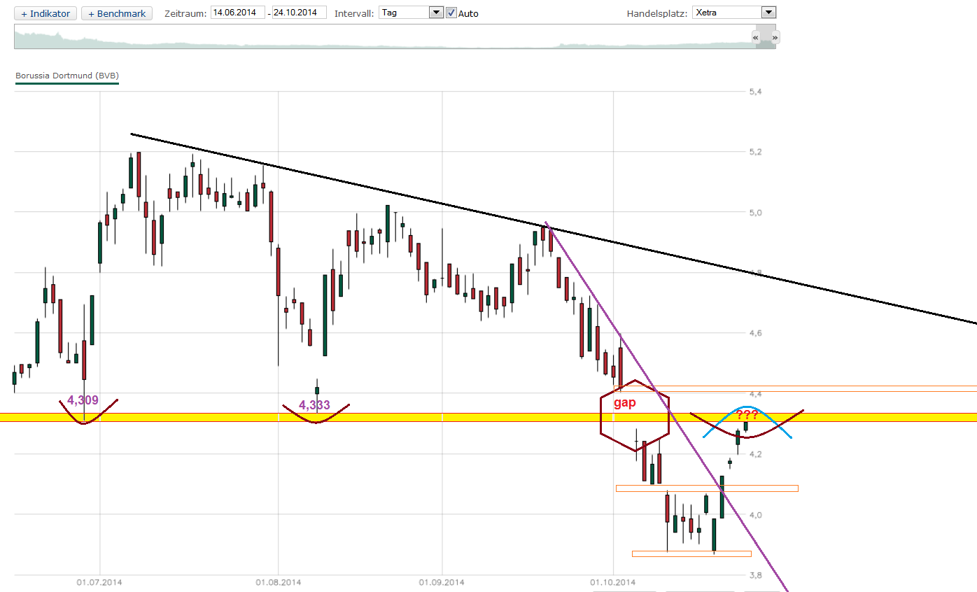 Diesen Rückgang bis ca. 4,10 erwarte ich im Moment mit einer sehr hohen Wahrscheinlichkeit, weil die Keilvollendung vor dem Hintergrund der Niederlage gegen Hannover so gut wie sicher erscheint. Weitere Voraussagen erscheinen mir verfrüht.