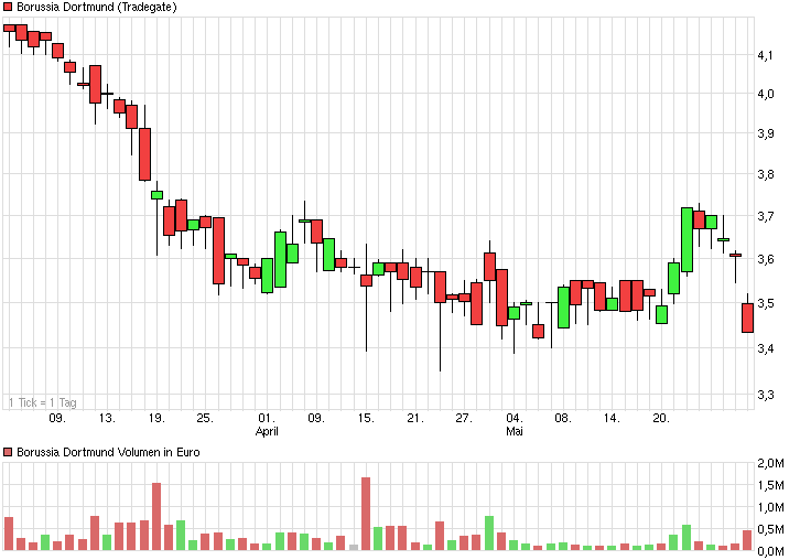 Von 5,10 bis jetzt dato roundaound 3,45€...das ist für mich ein klarer Werteverfall auf Basis der Fakten .Fakten sind übrigens auch spielerische Ergebnisse.Da nun mal der BVB auf den wichtigsten Turnieren keine Rolle mehr spielt ,geht es wohl auch deshalb abwärts.Insofern wird hier die Zukunft gehandelt und behandelt, und so manch Anleger ist mächtig enttäuscht ,was um dem BVB herum alles passiert,Trainerwechsel ,miserable Spieler> Kosten/ Nutzenverhältnisse unter aller Würde .desolates Reus'sche Ansehen etc.Ich könnte hier nun wirklich Romane schreiben ,was alles hier im Argen ist/war oder auch noch werden wird ,wenn ich die kommende Saison mit Tuchel betrachte .Wenn er ein Toptrainer wäre,wie ihr das so bezeichnet in eurem jugendlichen Leichtsinn, ,dann wäre schon längst der Kurs gestiegen... insofern... ,weil Anleger damit assoziieren das selbiger zumindest das Niveau von Kloppo ansatzweise erreicht,aber nein er tut es nicht ,ganz im Gegenteil.Aber wie man sieht ist das Vertrauen in ihm und auch wohl in Watzke angeschlagen.Macht mal eine Umfrage auf dem Westenhellweg oder Borsigplatz dann kann man sich dergestalt vorstellen ,wie ein Tuchel hier bewertet wird.