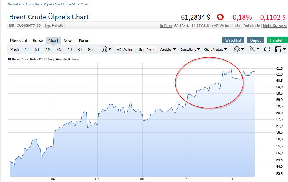 Brent vor fünf Jahren bei Ca. 107 Dollar, heute immer noch bei 61 Dollar- <-- Das ergibt ein Minus von 47%!