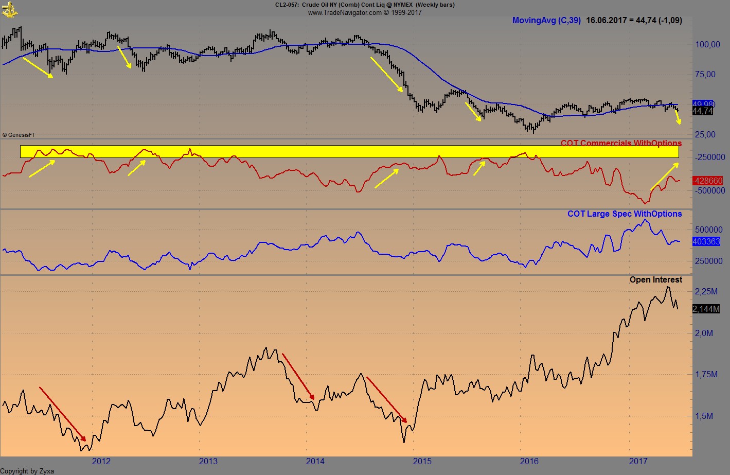 Punkt 2, Öl, wie ich schon geschrieben habe, hat mich die Vorgehensweise von Jakob angeregt es bei Öl mit den Langläufern zu probieren. Ein bisschen auch Exit, die ersten beiden Deals waren zwar auch Langläufer, die habe ich aber mit 10/15 % wieder abgegeben und billiger wieder gekauft. Seit dem habe ich mit größeren Abständen nachgekauft. Beim letzten down hat es nicht mehr geklappt. Das Contango ist inzwischen bei 3 $, deshalb sind es bei den 2018er Scheinen nicht tiefere Tiefs. Jetzt schau ich mir das weiter an. Wenn es tiefer geht, kaufe ich nach, wenn es hoch geht nehme ich Gewinne mit (durch Contangoabbau erwarte ich aber keine analoge Kursentwicklung zu den aktuellen Scheinen). Ich sehe hier ein begrenztes Risiko über einen relativ langen Zeitraum.
