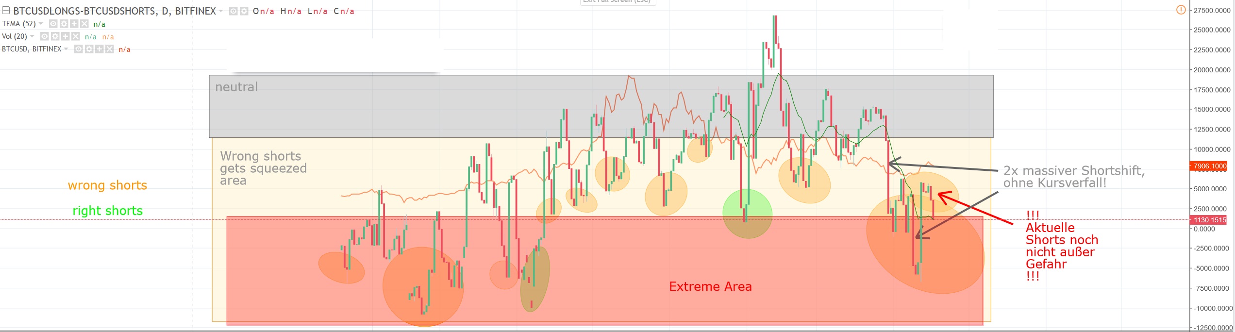 Der neutrale Bereich für BTC ist im Nettoshortchart (alle Longs minus alle Shorts) immer weit im positiven Bereich und nicht bei 0, wie man das von anderen Werten gewohnt ist.