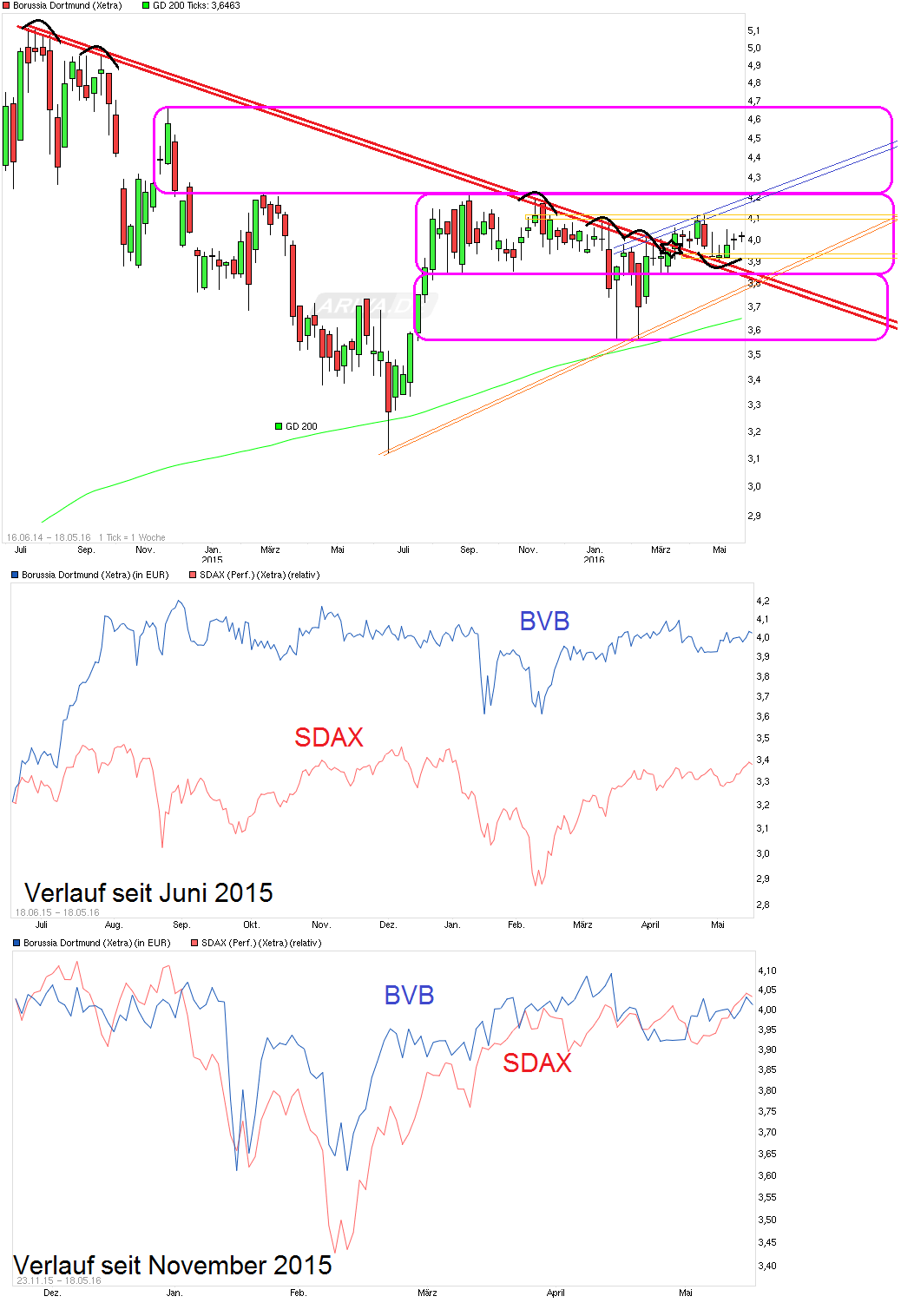 Abgesehen davon find ich deinen Dax-Vergleich der letzten 12 Monate nur noch hochpeinlich. Sorry! Das muss man mal so klar sagen. Du nimmst faktisch das Tief der letzten 2-3 Jahre und vergleichst es fast mit dem Hoch im Dax. Das ist so als würde ich den BVB-Kurs mit dem Dax seit Juli/August 2014 vergleichen, wo der Dax weit besser lief. Fakt ist, der BVB-Kurs lief im 3Jahresvergleich weit schlechter als der SDax und im 5Jahresvergleich genauso wie der SDax. Da sind also reichlich Sommerpausen enthalten.