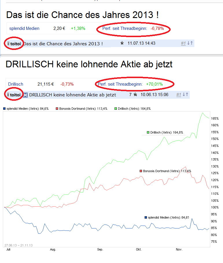 die threads, in denen du monatelang nichts geschrieben hast und dann zufällig gesehen hast ,dass der kurs dort stieg .-))...da warste schon längst wieder raus, nachdem du wieder mal zu ungeduldig warst, ein paar tage abzuwarten ...kennen wir doch schon von dri, wo du aber im gegensatz zu den anderen beiden genannten threads fast taeglich geschrieben hast....-)