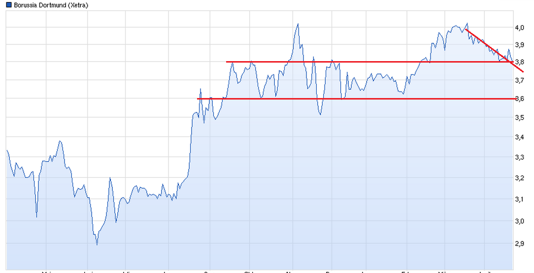 allein der buchwert liegt bei roundabout 3 euro...darueber hinaus liegt der substanzwert aber viel hoeher...der kader ist mitte des jahres mit knapp 300 millio bilanziert worden...heisst deutliches potenzial an stillen reserven...in der summe macht das einen fairen fundamentalen kurswert, der bei mittlerweile ueber 5 euro liegt...der kurs bewegt sich momentan bei 3,64 euro...somit ist ein zittern voellig unnoetig, denn allein durch die erfolge in der cl und dem pokal sind schon wieder neue fette gelder generiert worden, die mindestens, zum jetzigen zeitpunkt, 6 euro als fair erscheinen lassen...dies unter dem gesichtspunkt, dass der bvb in cl und pokal rausfliegen solllte...