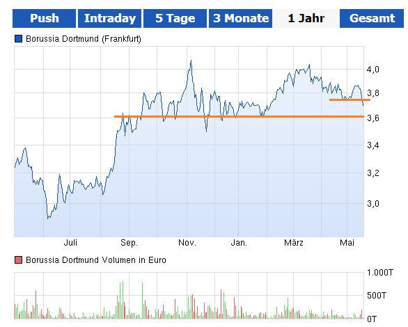 Vielleicht erreicht Ihr zum Saisonauftakt wieder die knapp 4 Euro und wenn der BVB nicht so doll (erwartet wird man gewinnt alles in Liga außer gegen Bayern) gehts wieder runter Richtung 3,70 Euro.