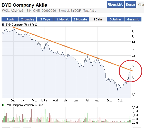 Dies entspricht immerhin einem Zuwachs gegenüber dem Vorjahr von 9,1 Prozent. Insbesondere das Modell S6, seines Zeichens der erste SUV von BYD, verkaufte sich vergleichsweise gut. Schafft BYD den Rebound?Dass der Umsatz im dritten Quartal wieder um knapp elf Prozent auf 11,79 Milliarden Yuan anziehen konnte, sieht das Unternehmen als Lichtblick: BYD rechnet damit, dass sich der Rückgang beim Nettogewinn im nächsten Quartal verringern wird.
