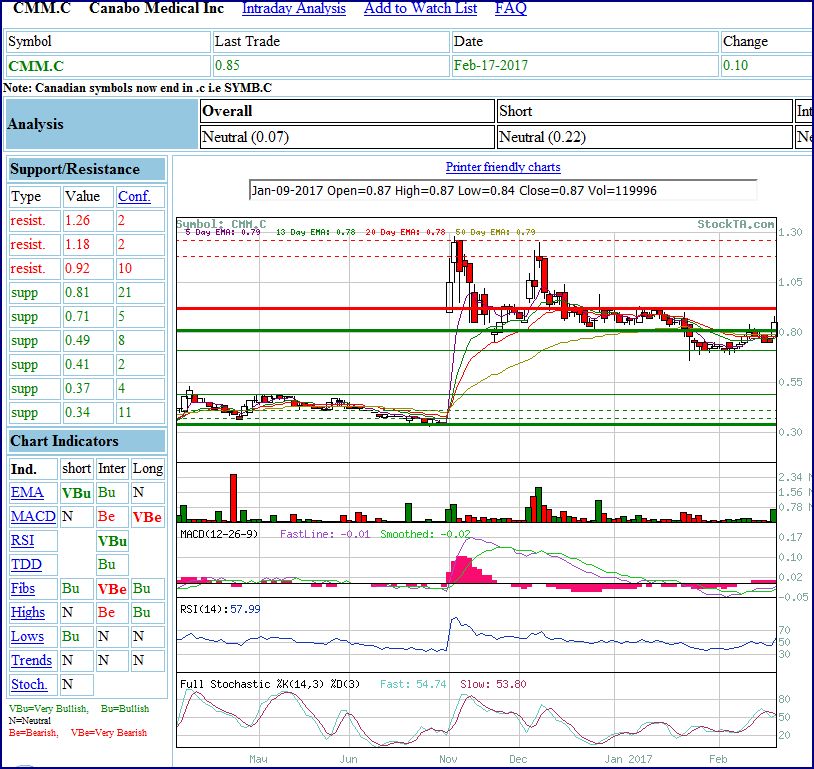subjektive Einschätzung : über den signifikanten Widerstand bei C$0,92 mit 10er Stärke muss der Kurs zügig und nachhaltig drüber.... im weiteren Verlauf aus meiner Sicht erst bei circa C$1,00 der Bruch des langfristigen Trends.... Gewinnmitnahmen, ausbleibende News oder grundsätzliche Veränderung des Sentiments in der Branche könnte jedoch aus meiner Sicht den Weg gen Nord am Widerstand bei C$1,18 vorerst beenden.....
