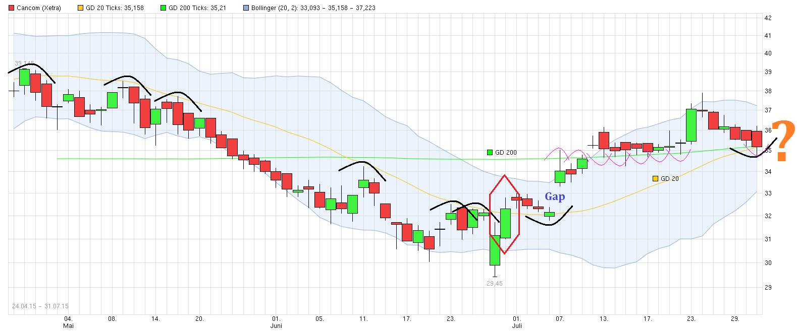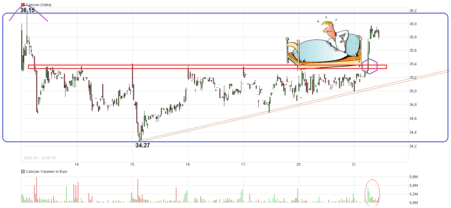 Im Mai und Juni ist man ja immer wieder am mittleren Bollinger Band bzw. der SMA20 nach unten abprallt. Dann Ende Juni gelang der Durchbruch über die SMA20 und bei einem anschließenden Pullback Anfang Juli ist man an dieser Linie wieder nach oben abgeprallt. Zugleich ist man die letzten Wochen wieder über die SMA200 gelaufen und hat diese Linie mehrfach zuletzt immer wieder intraday angetestet, um dann doch wieder darüber zu schließen. Aktuell steht man jetzt wieder genau an der Grenze zu diesen beiden Linie nach Bekanntgabe der vorläufigen Hj.1 Zahlen. Damit stellt sich jetzt die Frage, ob die Zahlen ausreichen werden, um den Kurs weiter über diesen beiden Linien zu halten oder ob man doch nochmal etwas weiter konsolidiert (zumal ja auch der Gesamtmarkt nur sehr zögerlich gegenwärtig nach oben zieht und in den kommenden Wochen auch nochmal nachgeben könnte). Ich fand die Zahlen jetzt garnicht so übel. O.k., über die Marge im 2. Q. ist vielleicht nicht jeder völlig zufrieden. Aber da muß man erstmal abwarten was noch alles genauer gesagt wird bei Bekanntgabe der finalen Zahlen, speziell zur weiteren Prognose für die kommenden Quartale und welche (einmaligen) Sonderfaktoren weiter Einfluß haben. Ohne diese Sonderfaktoren scheint man ja weiter gut zu wachsen =>http://www.ariva.de/news/...ncom-waechst-um-knapp-ein-Viertel-5442749 ".... 2014 war Cancom unter der Führung von Vorstandschef und Firmengründer Klaus Weinmann beim Erlös dank mehrerer Übernahmen um über ein Drittel gewachsen, beim operativen Gewinn um fast zwei Drittel. In diesem Jahr soll erneut ein vergleichbares Umsatzplus über dem Marktdurchschnitt herausspringen, je zur Hälfte aus eigener Kraft und zur Hälfte aus weiteren Zukäufen. Das um Sondereffekte bereinigte Ebitda soll stärker zulegen als die Erlöse.."