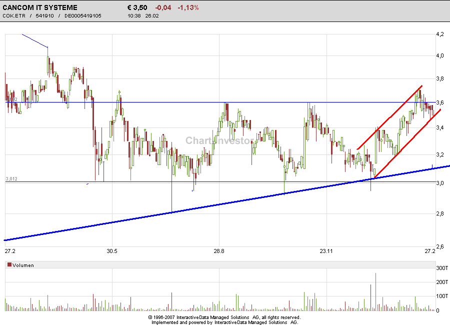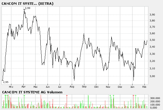 Unter dem Strich habe sich das Jahresergebnis auf 2,41 (1,00; Independent Research-Prognose: 1,38) Mio. Euro beziffert, während das EPS bei 0,24 (0,10; Independent Research-Prognose: 0,13) Euro gelegen habe. Mit den Geschäftszahlen 2006 habe CANCOM sowohl die Erwartungen der Analysten als auch die eigene Guidance (Umsatz: 230 bis 250 Mio. Euro; EBIT: 2 bis 4 Mio. Euro) übertroffen.