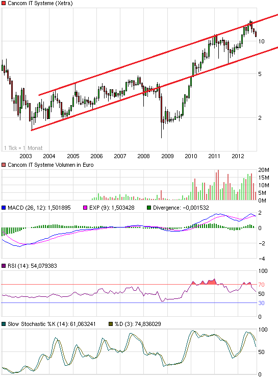 Ab Anfang 2007 wurde aber dann das Wachstum geringer und später stagnierte man und dann brahc 2008 der Gewinn ein. Das ist immer das gleiche Prinzip. Die Kurse nehmen die Entwicklung insofern vorweg, als das nicht unbedingt ein Gewinneinbruch erwartet wird, aber die Anleger nach 3-4 Jahren Hausse einfach vorsichtiger werden und keine KGVs von 15 mehr zahlen, selbst wenn noch wie jetzt von dir beschrieben, im März 2013 noch gute 2012er Geschäftszahlen präsentiert werden. Das heißt, letztlich brechen die Kurse schon weg, obwohl der Nettogewinn noch steigt. Fällt dann der Nettogewinn 2013 oder 2014, kommt erst der richtige Einbruch. Cancom beispielsweise ist zudem 2008 im Kurs stark gefallen, obwohl die Geschäftsentwicklung eigentlich ganz gut war. Jetzt stell dir mal vor was passiert wenn der Gewinn 2013 um 10% und 2014 um 30% fällt! Obwohl das EPS voraussichtlich dann noch bei 0,7-0,8 € liegen würde, kann ein Kurs dann durchaus auf 7 € oder tiefer fallen. Das ist jetzt natürlich alles noch Spekulation. Mir gehts nur darum, mal die Mechanismen der Börse in psychologischer Hinsicht zu verdeutlichen. Man muss als Anleger oft schon 1-2 Jahre im voraus erkennen, wenn bei konjunktursensiblen Unternehmen das Bewertungshoch erreicht ist. Das liegt meist zeitlich deutlich vor dem Gewinnhoch des Unternehmens.