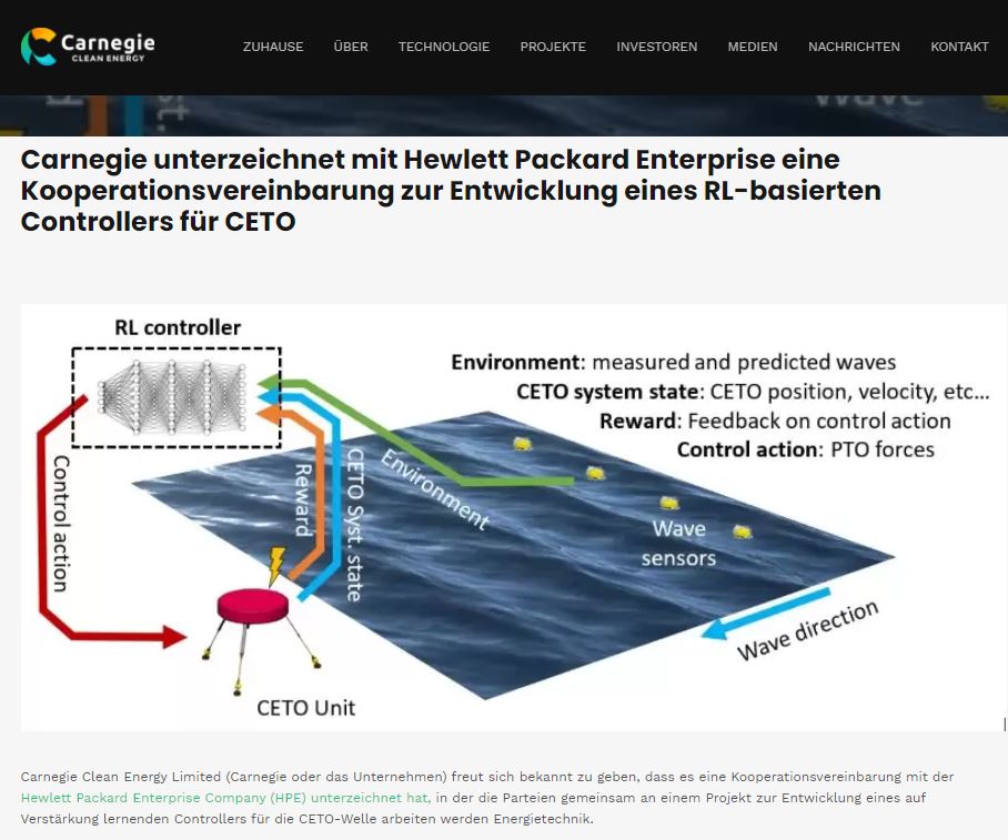 Carnegie unterzeichnet Kooperationsvereinbarung mit Hewlett Packard EnterpriseUnternehmen (HPE) entwickelt einen auf Verstärkung lernenden Controller für CETOCarnegie Clean Energy Limited (Carnegie oder das Unternehmen) freut sich bekannt zu geben, dass es eine unterzeichnet hatKooperationsvereinbarung mit der Hewlett Packard Enterprise Company (HPE), in der die Parteien dies tun werdenArbeiten Sie gemeinsam an einem Projekt, um einen lernbasierten Controller für das CETO zu entwickelnWellenenergietechnologie. Die Arbeit wird die Entwicklung der künstlichen Intelligenz bereits erweiternunterwegs in Carnegie.Die Hewlett Packard Labs werden ihre Fachkenntnisse im Bereich des verstärkten Lernens (RL) und des Rechnens einbringenRessourcen für das Projekt, zusammen mit Carnegies Team, das bereits eine intelligente entwickeltController für die CETO-Technologie. Die RL-basierte Controller-Entwicklung in diesem Projekt wird in stattfindenparallel zur laufenden Arbeit des Carnegie-Teams an einer Maschine und bieten die Möglichkeit, diese zu verbessernLernbasierte (ML) intelligente Steuerung.Reinforcement Learning ist ein Bereich der künstlichen Intelligenz, in dem ein Modell für maschinelles Lernen erstellt wirdmit der Fähigkeit, sich selbst zu lernen. Während die derzeit in der Entwicklung befindliche intelligente Steuerung mussOptimieren Sie die Reaktion des Geräts für jede Welle (unter Verwendung von ML-Modellen innerhalb der Optimierung), die RLDer Controller hat die Fähigkeit, direkt zu lernen und die optimale Reaktion auf vorhergesagte Wellen während anzuwendenBetrieb. Der RL-Controller, der mit einem einfachen Steuerungsschema vorinstalliert ist, erkundet diesAus dieser Referenz wird das Konzept der Belohnung verwendet, um gute Kontrollmaßnahmen zu identifizieren und zu lernen.