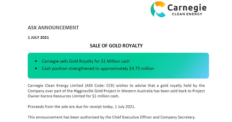 Am 1. Juli verkaufte Carnegie eine vom Unternehmen gehaltene Goldlizenz über einen Teil des Higginsville Gold