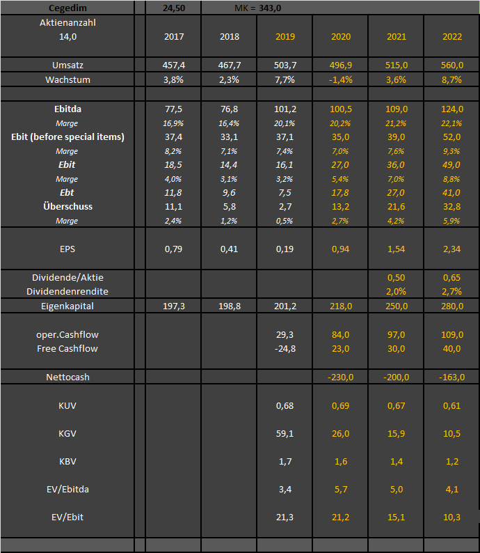 Und das ist ja auch die eigentliche Story, zumindest für mich. Ich hoffe zwar natürlich auch, dass Cegedim nach Corona wieder deutlich wächst (zumindest mit den 7-8% der 4-6 Quartale vor Corona), aber die eigentliche Story ist doch, dass Cegedim endlich mal ein paar normale Jahre ohne diese blöden Sondereffekte auskommt. Dann müsste man 2022 eigentlich auch 40 Mio vor Steuern verdienen können. Ist ja nun kein Hexenwerk. Aber andererseits bei dem Vorstand auch kein Selbstläufer, um es freundlich zu formulieren.