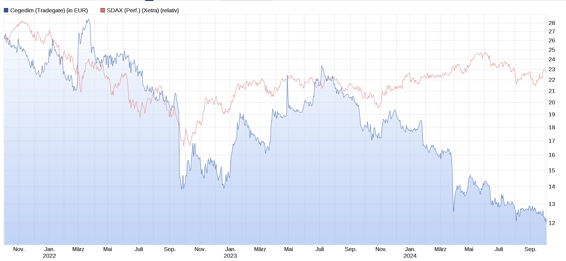 um die ganz aktuelle Performance im Hier und Jetzt. Cegedim hat jetzt Zahlen veröffentlicht, die waren aber wenig inspirierend und folglich performt die Aktie weiterhin einfach nicht gut, konkret schlechter als andere Nebenwerte, SDAX usw.