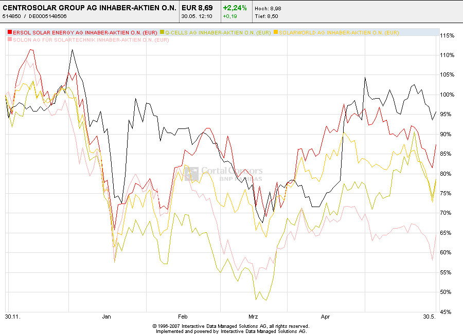 Die teilweise negativen Wachstumsprognosen für den Solarsektor teilt Weiss nicht. Zwar schließt er potenzielle Überkapazitäten für 2009 und 2010 nicht aus, sieht aber in den USA und Spanien weiter hohes Wachstumspotenzial. Auch in Märkten wie Griechenland und Italien sei die Solarindustrie auf dem Vormarsch. Die Kürzungen der Subventionen in Deutschland sollten nach Meinung von Weiss in den kommenden Jahren durch dezentrale Stromversorgung aufgefangen werden. "Dann wird für die Verbraucher der Preis für Strom aus der Steckdose teurer sein als die Elektrizität von eigenen Solarzellen auf dem Dach."