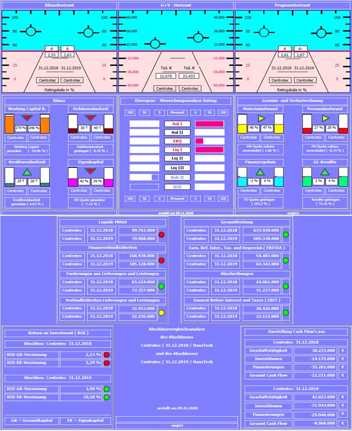 Positiv: Gesamtleistung um ca. 6% gestiegen. Rohertrag II-Quote konnte verbessert werden. Jahresübrschuß fast verdoppelt. Gute Eigenkapitalausstattung (39%) und Working Capital Ratio (246%, vielleicht etwas überdimensioniert).