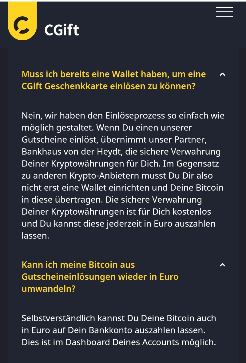 Zunächst ist festzuhalten, dass die CGift AG weder Geschenkkarten verkauft noch Kryptowaehrungen handelt (ist ja so auch nachzulesen), sondern diese Services ausschließlich über Geschäftspartner erfolgen.