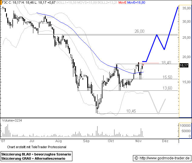 Rückblick: Die SFC SMART FUEL CELL Aktie markierte während ihres kurzen Börsendaseins im Mai 2007 bei 55,50 Euro das Allzeithoch und startete eine Abwärtsbewegung bis 10,45 Euro. Seit diesem Tief im September erholt sich die Aktie, wobei sie aktuell wieder das Oktoberhoch bei 18,40 Euro attackiert. Das Chartbild ist auf sämtlichen Zeitebenen neutral zu werten.