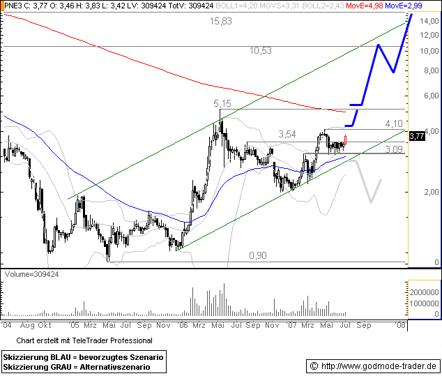 Rückblick: Die PLAMBECK Aktie (Nachrichten/Aktienkurs) markierte nach einem extremen Kurseinbruch im April 2005 ein Allzeittief bei 0,90 Euro und erholte sich anschließend bis auf 5,15 Euro im Mai 2006. Nach einer ausgedehnten Abwärtskorrektur bis 2,00 Euro steigt die Aktie in diesem Jahr wieder an. In dieser Woche überschreitet sie den Horizontalwiderstand bei 3,54 Euro, welcher seit Mai eine unüberwindbare Hürde darstellte. Das kurzfristige Chartbild hat nun wie das mittelfristige auch leicht bullische Tendenzen.