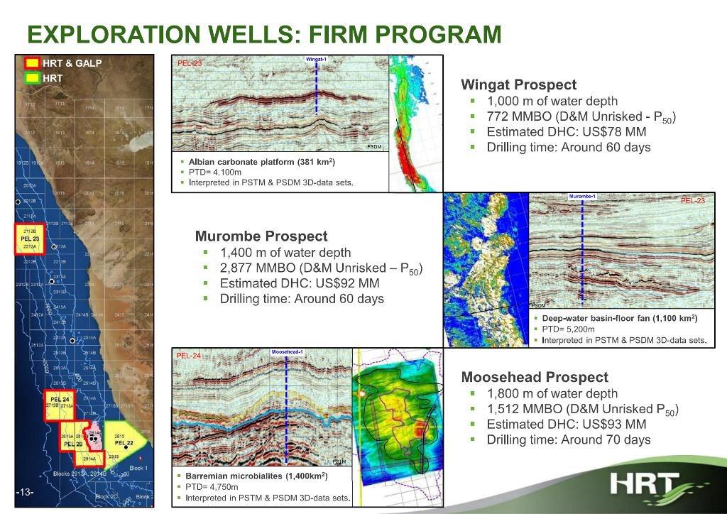 · The Namibian Central Area partnering process will be initiated in 3Q 2013 with the aim of drilling with a partner in 2014. The two principal prospects have gross mean unrisked prospective resources estimated at 1.1 billion barrels ("Bbbls") and 570mmbbls.