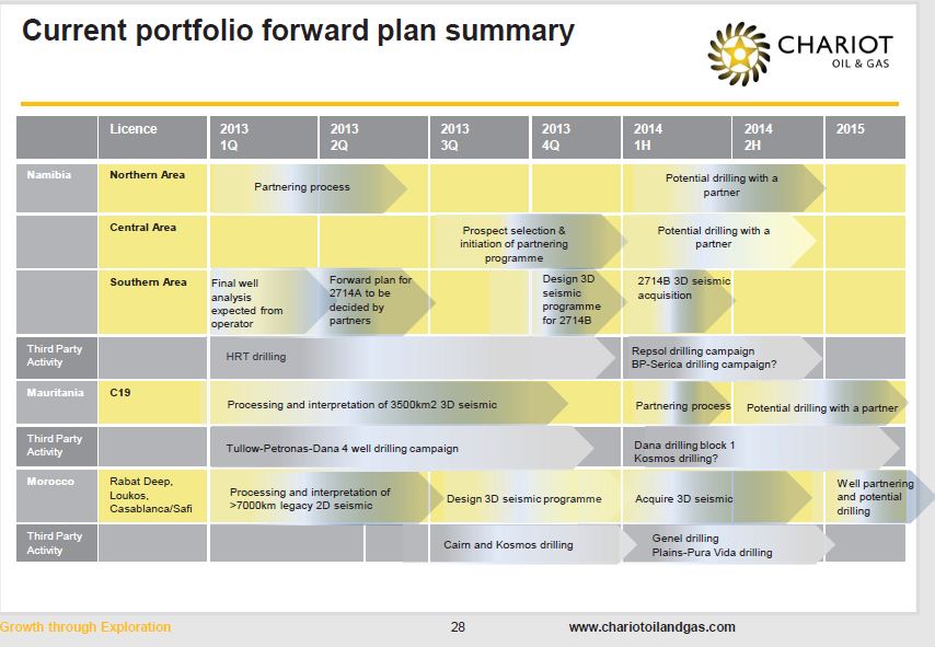 Chariot has already received industry interest in its Mauritanian acreage and a process to identify a partner for drilling will be initiated once interpretation is complete. Should this be successful, it is anticipated that drilling will commence in 2015.