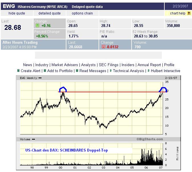 Chart der EWG-Index-Aktie (Amex): Ein amerikanischer Naivling, der den DAX in Dollar analysiert, könnte jetzt auf die - hirnrissige - Idee kommen, wir hätten ein DOPPEL-TOP. Die rote waagrechte Linie im Dollar-Chart ist im Original-Dax-Chart deutlich abschüssig!
