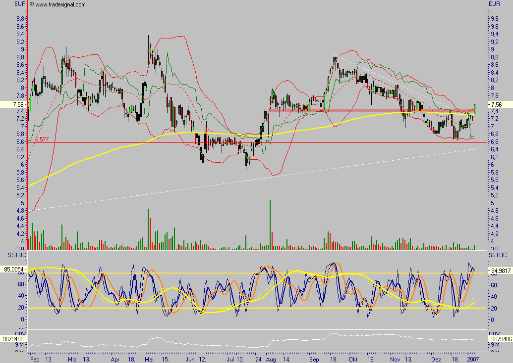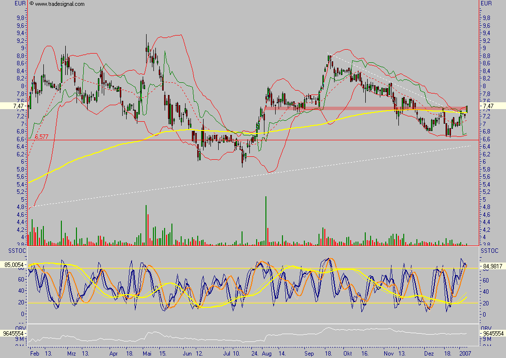 Der Chart scheint langweilig, das könnte sich allerdings rasch ändern, nämlich dann, wenn die Aktie aus dem mehrjährigen Dreieck ausbricht, der Turnaround ist geschafft, der Cash-Flow ist deutlich positiv, KGV unter 10 und Ergebnis pro Aktie von 0,65 (9-Monate) sprechen für höhere Preise, zumindest sollte die Aktie recht gut abgesichert sein, Kurse über 7,20 würden einen kleinen Ausbruch signalisieren, wobei bereits über 7,40 ein nachhaltigeres KS generiert werden sollte.