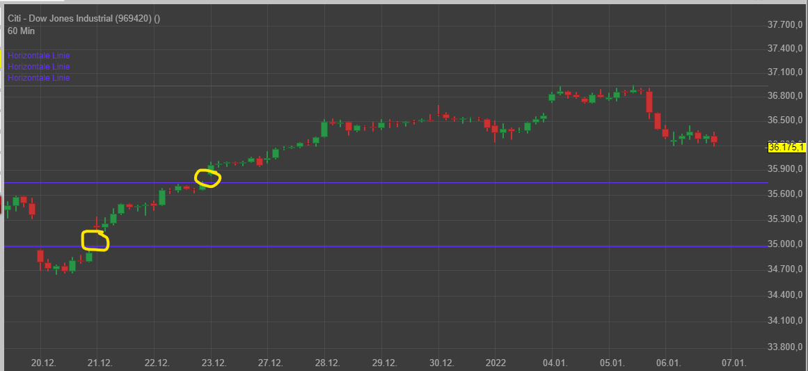 Ich habe einfach mal die Weihnachtsmannrally vom 20.12. eingezeichnet. Man sieht klar den Trendbruch und das (knappe) verfehlen des ATH. Beides für mich keine wirklichen Kaufsignale.