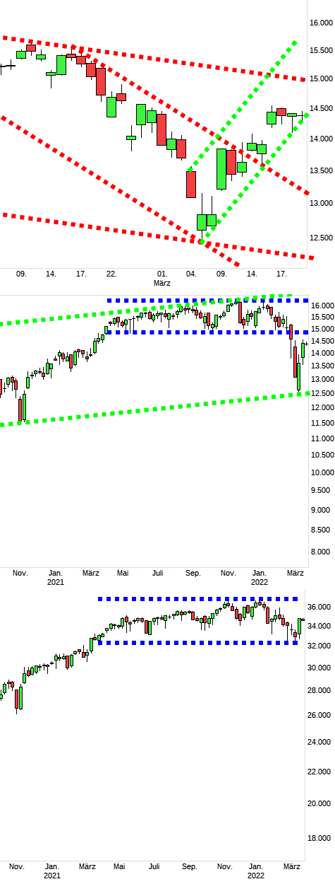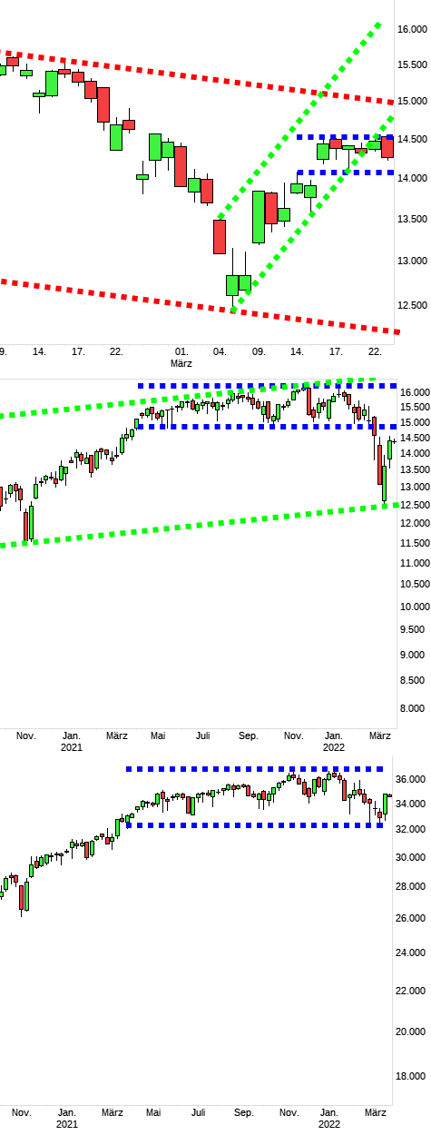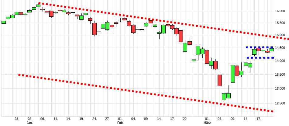 Der DAX hatte im Vergleich zum DOW nach unten übertrieben und holt dies jetzt wieder nach. Im Tageschart bewegt er sich weiter seitwärts und wird den steilen Aufwärtstrend bald verlassen, es sei denn, morgen kommt ein Sprung nach oben. Der DAX hat sehr viel Platz um sich auszutoben. Nach unten bis unter 14000 und oben wartet natürlich die 15000 als Hürde.